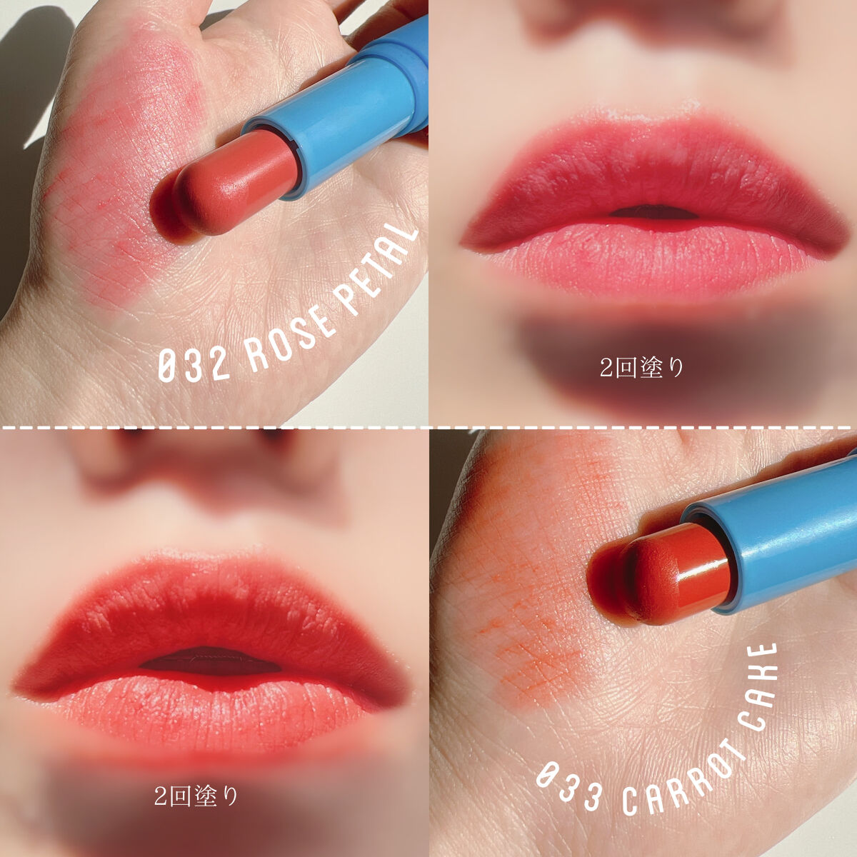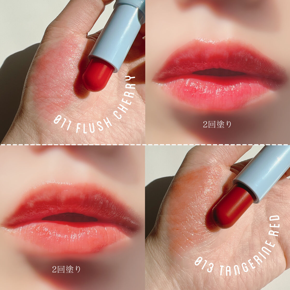 なめらかなつけ心地と落ちにくさすごい✨ ツヤっとしていて透明感もあり☺️ 膜を薄く張ったようなしっとり感で、 塗ってから60秒ほど待ち、 ティッシュオフしてもそのしっとり感は 残っている印象🌼 さらに色移りしにくい仕上がりでした🤍 食べたり飲んだりした時もフチだけ 色残り現象は特になかったです🌱 肌なじみのいいコーラルピンク💕 青みがかわいいモーヴピンクカラー💕 ほどよいテラコッタオレンジ系カラー🧡 青みのあるチェリーレッドカラー🌹 ブラウンレッド系のカラー🤎 ディープレッドカラー🥀