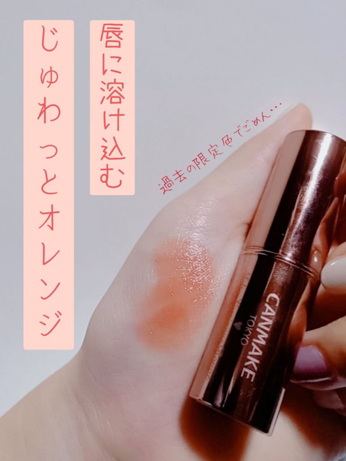 色味はオレンジ系、ピンクっぽさもある?からか、オレンジが主張しすぎず使いやすい粘膜カラー。 リップクリームみたいで保湿力あり💮 そして発色がいい!!シアー系だけどちゃんと色がつく✨ 色持ちはあまりしない⚠️ 色味、発色にこだわったリップクリームって感じ!!