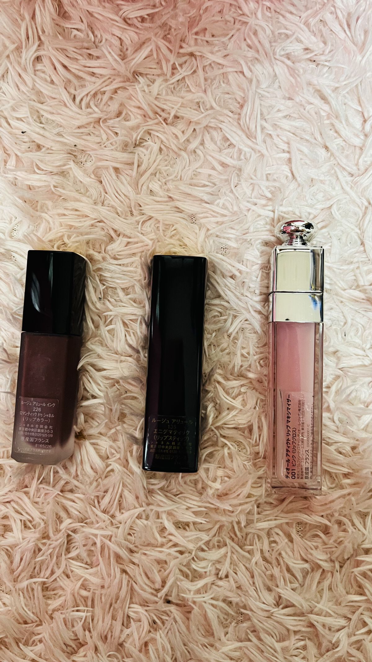 mirandaのお気に入りが詰まっている ポーチが可愛い Diorのクッションファンデで、日焼け止め効果とスキンケア効果をカバーします リップは場所によって雰囲気変えたいので、大人リップからガーリーなものまで多いけど3本は持ってます あと、頭痛薬と目薬あればなんとかなる!