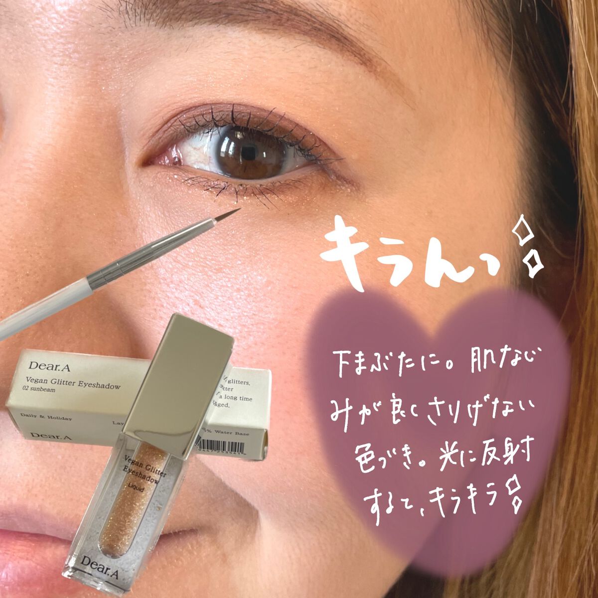 華やかなキラッキラ感はDear.Aがダントツ好み💎 コーラルカラーの02サンビー厶が大好きで現在2本目を愛用しているんだけど、01モーヴはまた全然違う印象でこれもかわいい…! 容量がちょっと少なめですが、定価1,400円とプチプラ。 そしてチップも非常に使いやすくてブラシ付き。 ずっと愛用してる推しコスメなので、グリッター難民はぜひDear.Aを1度試してみてほしいです💎