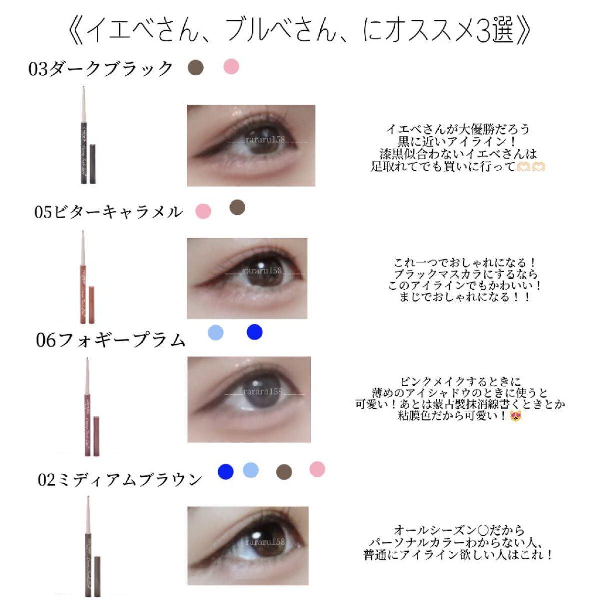 - 2024.6月下旬~ 容器デザインが順次リニューアル 尚、これにかかる商品の返品・交換は承っておりません。 とろける描き心地がたまらない! 1.5mmの超極細ジェルアイライナー くっきり濃密発色!キレイなラインが長続き。 1.5mmの超極細芯で、まつげのすき間埋めもラクラク♪ くり出しタイプなので使いやすい! 一度乾いて密着すれば、とにかく落ちにくい!