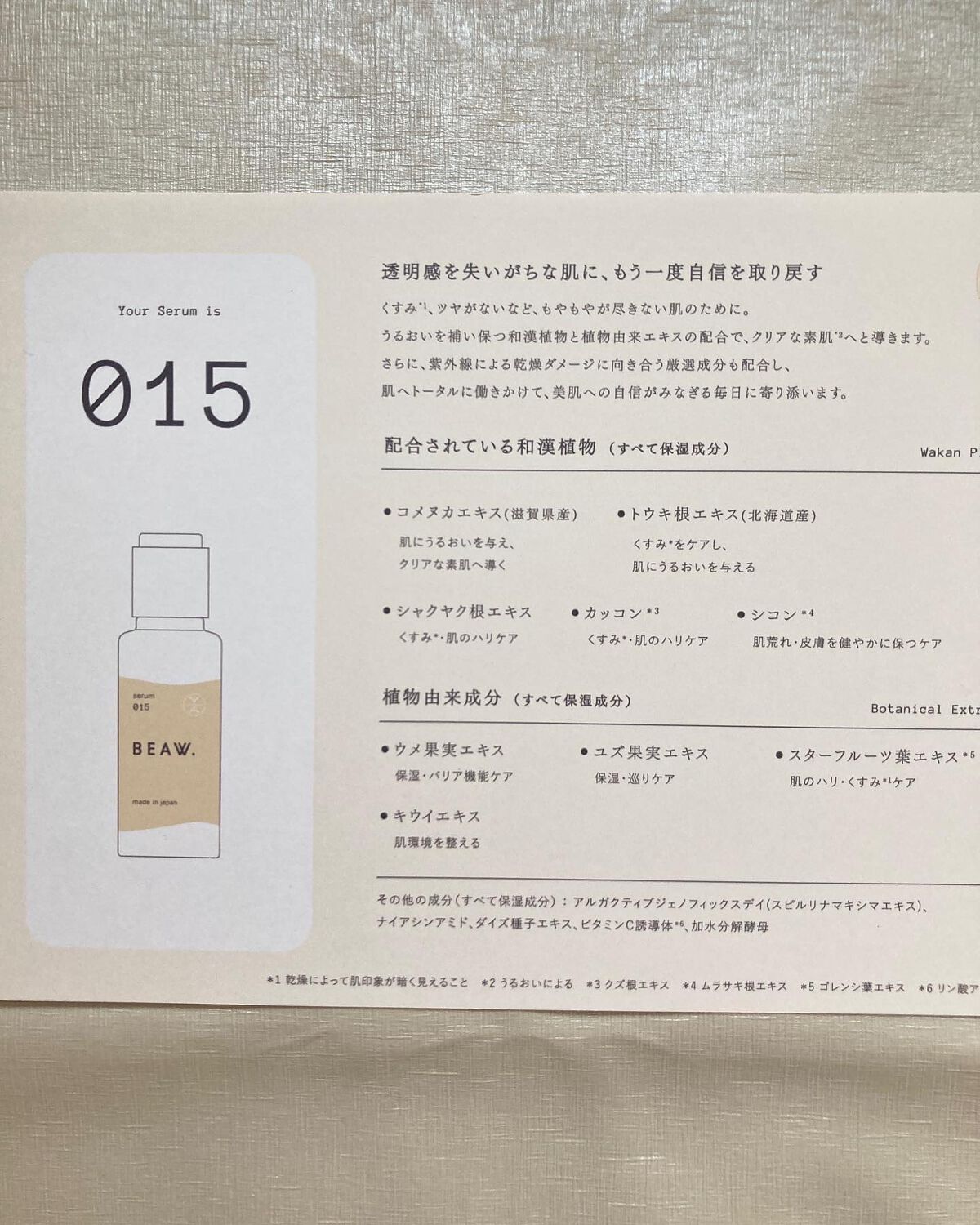 - ・BEAW.のパーソナライズケアは始めにパーソナライズ診断を行い、20種類の和漢と、自然由来の保湿成分の組み合わせから、一人ひとりに合わせた製品をお届けします。 ・現在の自分の悩みにぴったりのパーソナルケアキット、和漢植物由来成分を配合した2剤式のセラムとサプリメントのセットでお届けします。からだの内と外から同時に理想の美しさをめざせるデュアルケアで、あなたの美容をサポートします。 ・美容液は、肌荒れ予防、乾燥、毛穴、テカリ、くすみ*、年齢肌、ツヤ肌、などその人それぞれの悩みに対して適した処方で国産和漢植物成分と、植物エキス、ビタミンやセラミド、プラセンタ、ナイアシンアミド、などを配合した保湿成分を分析結果に合わせて配合。*乾燥による ・サプリメントは体の内側からキレイをサポートする国産和漢植物成分と20種類以上のビタミン、ミネラルをそれぞれに合わせて配合。 -対象商品- BEAW.リッチセラム003、008、015 BEAW.サプリメント:001、007、031 BEAW.フェイスウォッシュ:019、026、045 -内容量- BEAW.リッチセラム:30ml BEAW.サプリメント:60粒 BEAW.フェイスウォッシュ:80g
