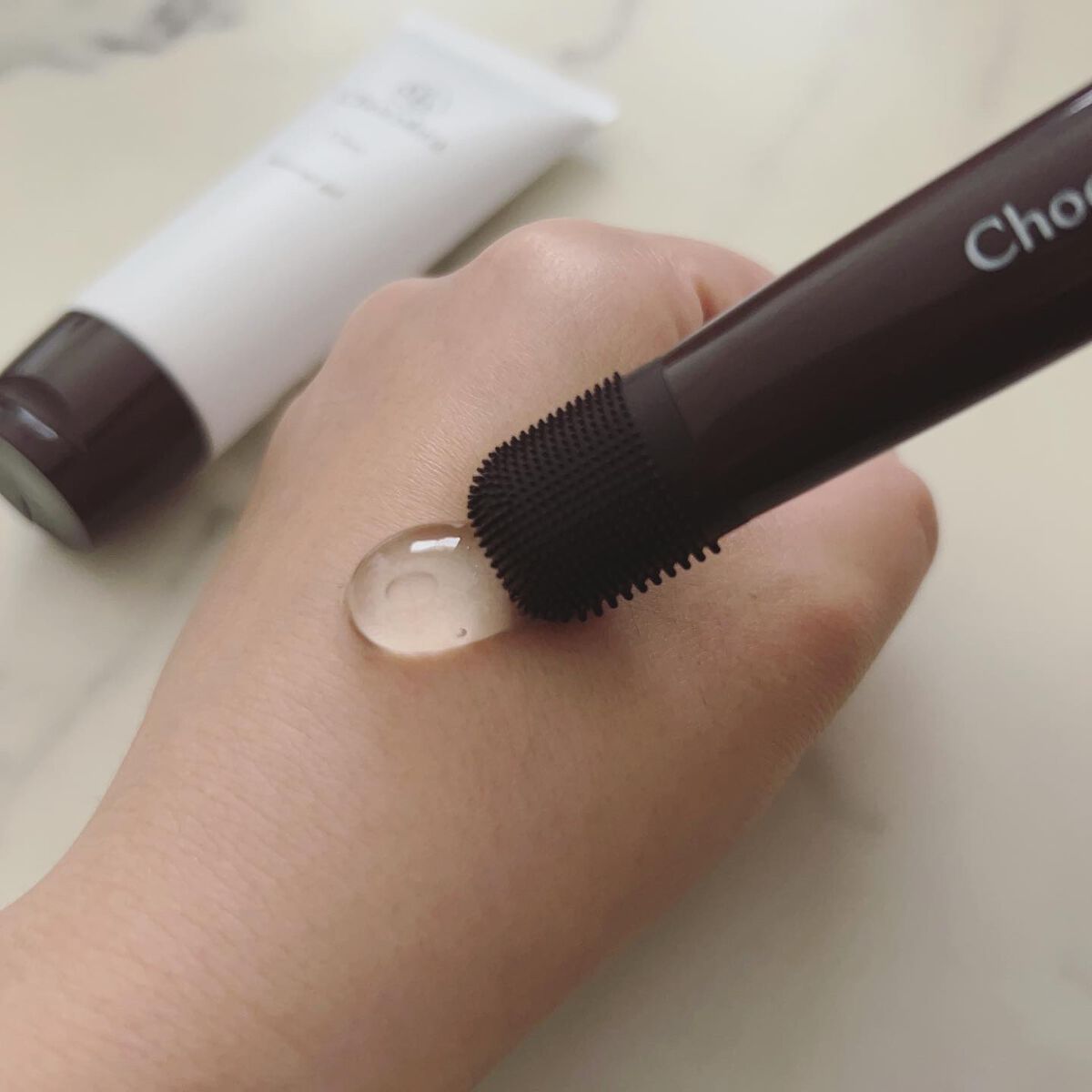 専用のブラシと濃密ジェルで毛穴にアプローチ 角栓ケア専用ブラシ ほどよい硬さで小鼻にジャストフィットする形状 ざらつきの気になる部分は細かい面のブラシ 角栓の気になる部分は粗い面のブラシで 粘度の高い温感ジェルでいたわりながらマッサージ 高純度ヒアルロン酸・コラーゲン配合 浸透型ビタミンC誘導体(VCエチル)配合でお肌にしっかり浸透 ジェルを塗ってクルクル🌀ブラシで優しくマッサージ*.+゚ 毛穴がスッキリします*.+゚ 洗い流してから化粧水と美容液塗ってます*.+゚ お家で毛穴ケアを簡単に出来るの嬉しい♡♥