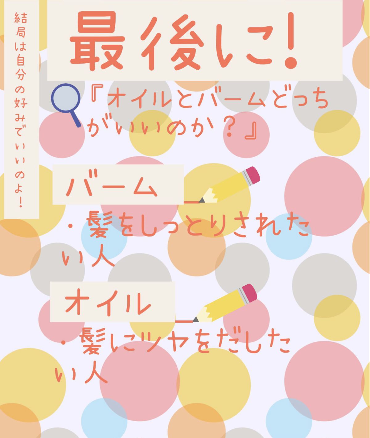 薬局に行くと多くのオイルやバームがあるので迷いますよね.. 調べて評価の良い物を買ったり、自分の髪にあった物を選んだり スタイリング剤のオイルと髪を乾かす前にやるオイルは全く違います!!! そこは気おつけましょう🕊