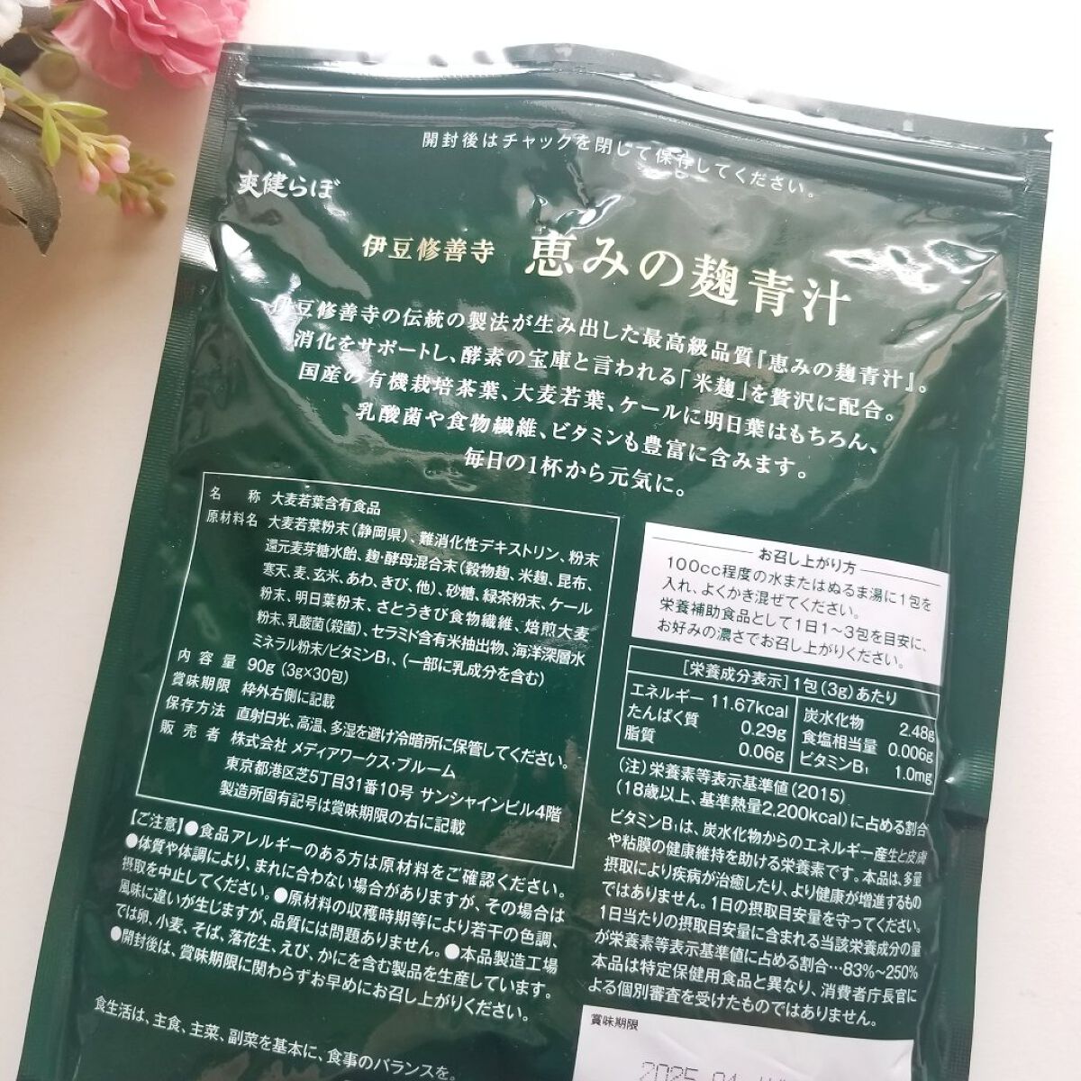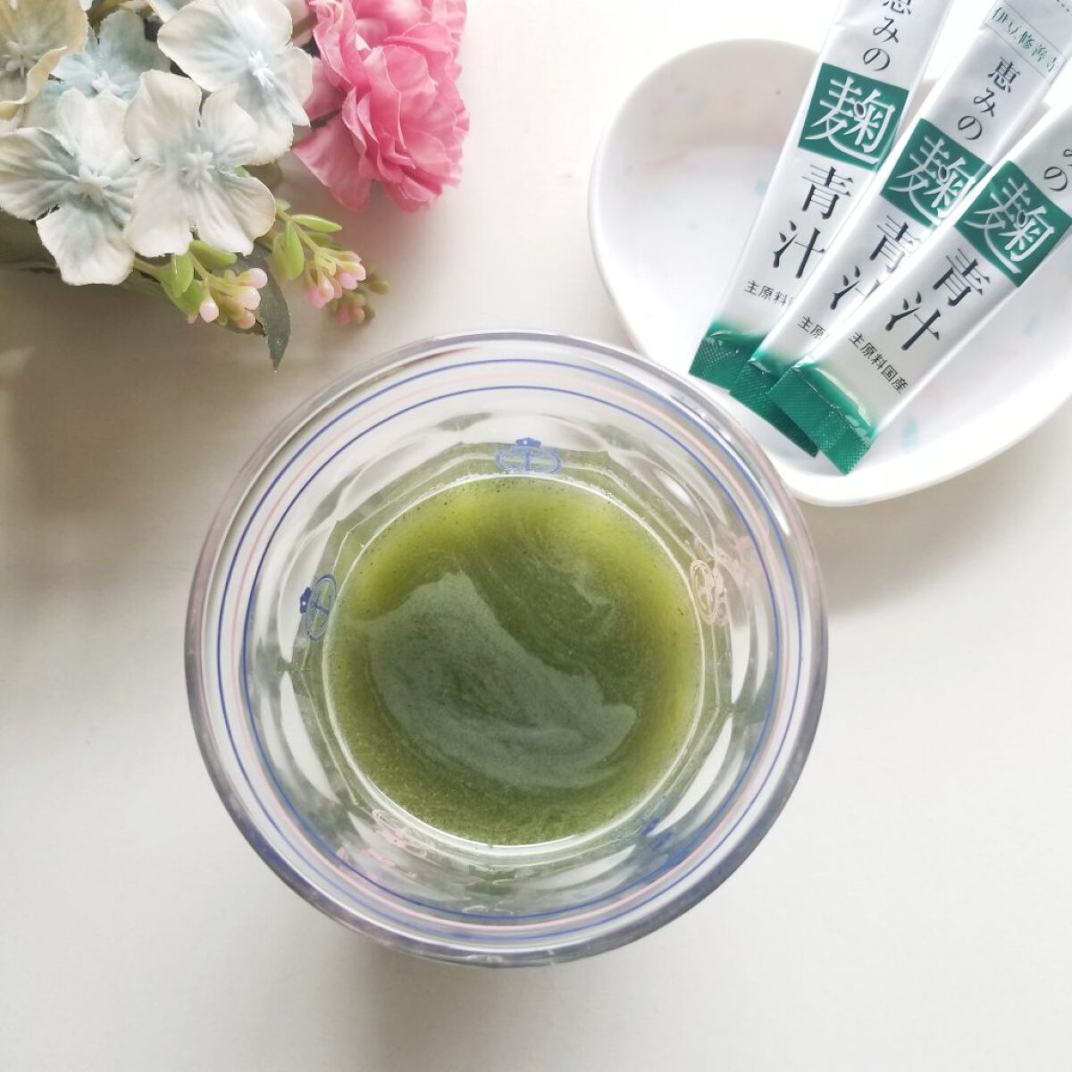 修善寺でしか作れない大麦若葉にケール、それに米麹と乳酸菌を加えた至高の麹青汁です。 100ml程度のお水や牛乳で溶かして飲みます。粉は溶けやすいです。 青臭さなどなく飲みやすい青汁でした!