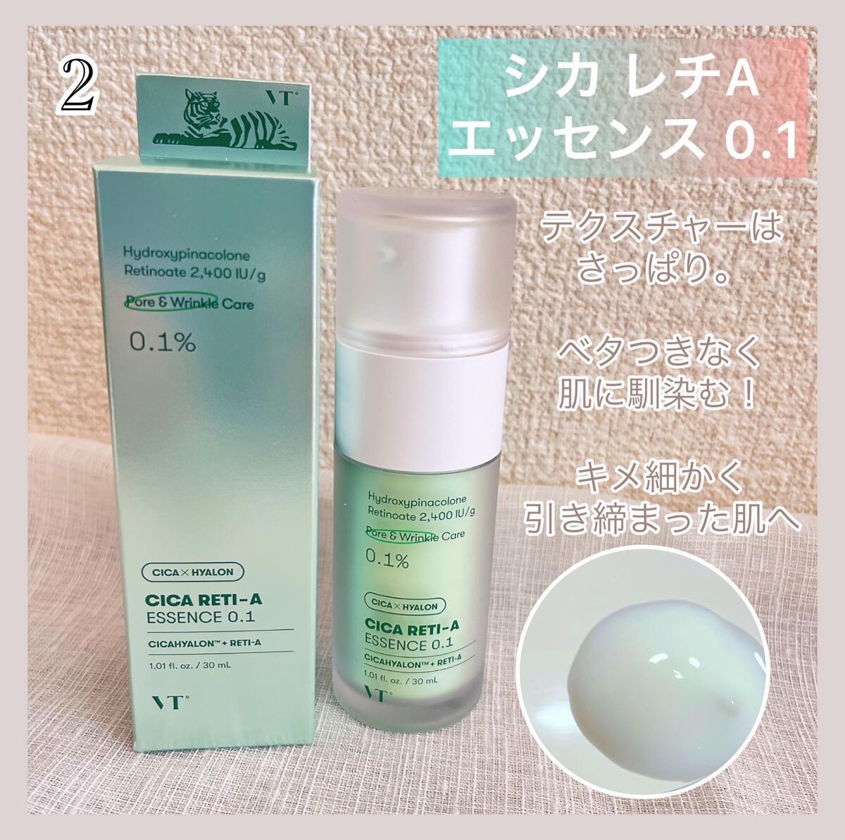 肌に美容液の通り道を開けて角質層まで深く届くから効果がしっかりでるテクスチャーはサラッとしてる けど、チクチクするのとピリつきがありますが馴染んでくると落ち着きます♪ 保湿ケアがかなり重要なのでシカレチAシリーズを使って保湿をしっかり行うことで効果が実感できます🌿✨ 最短で3日で効果を実感できると口コミが話題のVTシリーズ。ぜひオススメです♪
