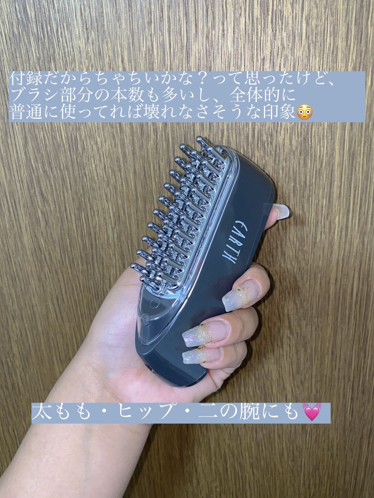 人気ヘアサロンEARTH 〈アース)さんとのコラボ付録で 赤色LED&振動機能つきのEMS電気ブラシが &ROSYさんの付録に付いてくるだなんて感動です🥹💖 サイズは全長12.2cmで 手にフィットしやすい大きさです😌 頭皮だけでなくてお顔や腕や足など 全身に使えるので一台持っておくと かなり重宝するハズですっ♪ 上ボタン🔘の振動機能の方が2段階 下ボタン🔘の赤色LEDとEMS機能の方が3段階 調節が可能なので 自分好みの振動とEMSの強さをカスタムしちゃってます☺️ 刺激が強すぎるなぁと感じる場合は 保湿した後やお風呂上がりなどに使用すると 刺激を感じにくくなるとの事ですが 防水機能はついていないそうなので(お風呂では🆖🙅♀️) 取り扱いには注意が必要です😌