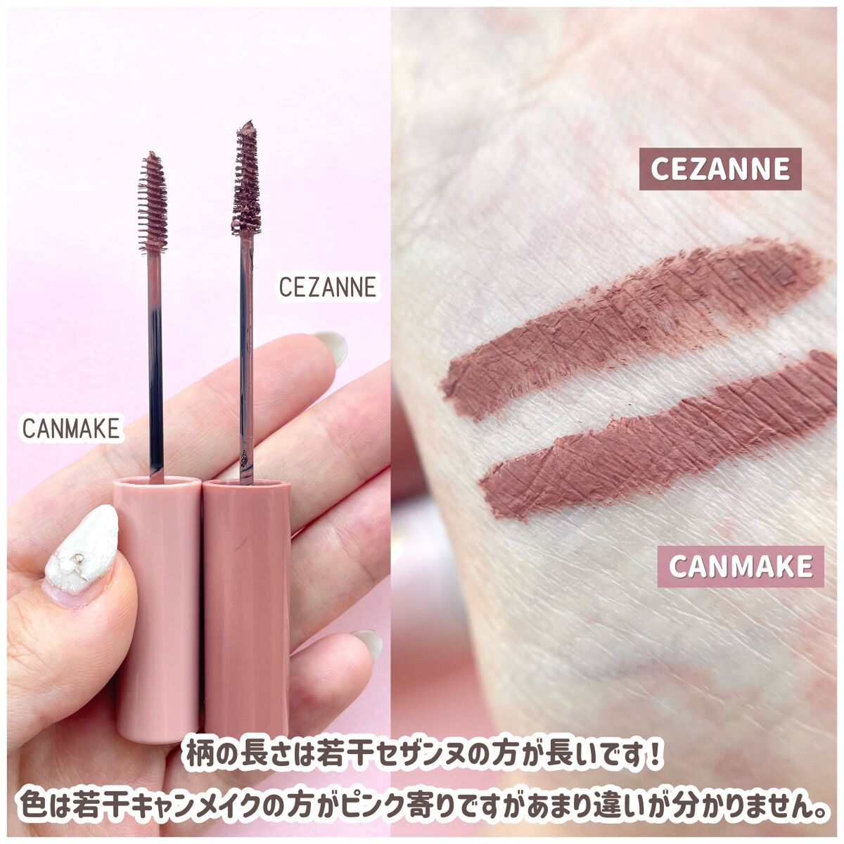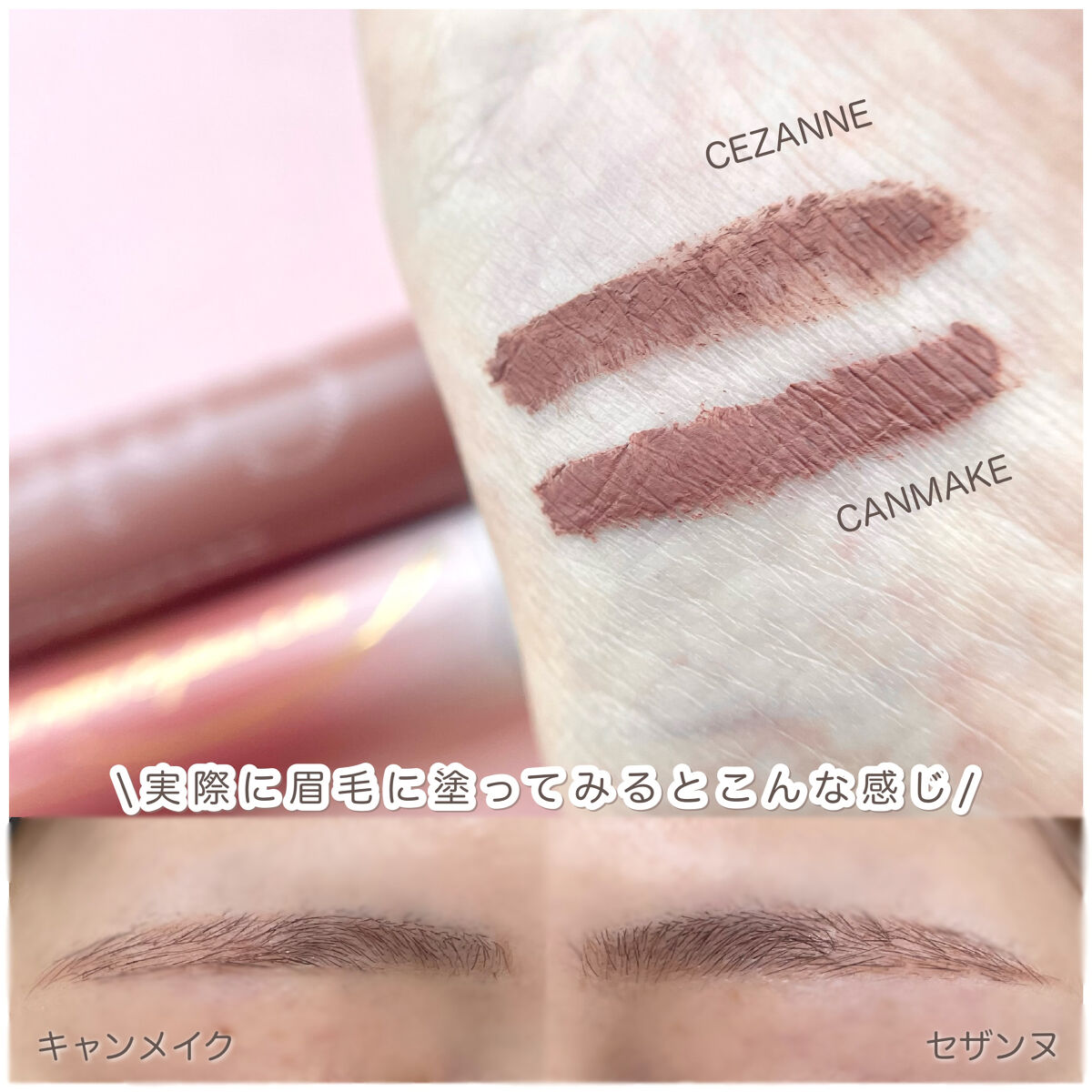 柔らかなピンク眉になります🩷 地肌につかず、塗りやすいです。ブラシはより丸くて短め。CEZANNEよりピンク色に染まり、ピンクメイクするときにおすすめ💕 優しいピンクブラウンに色づきます CANMAKEよりブラウン強めです🤎 塗りやすく、地肌につきません。ブラシはCANMAKEより細長い。仕上がりがナチュラルなので、日常使いにおすすめ👍