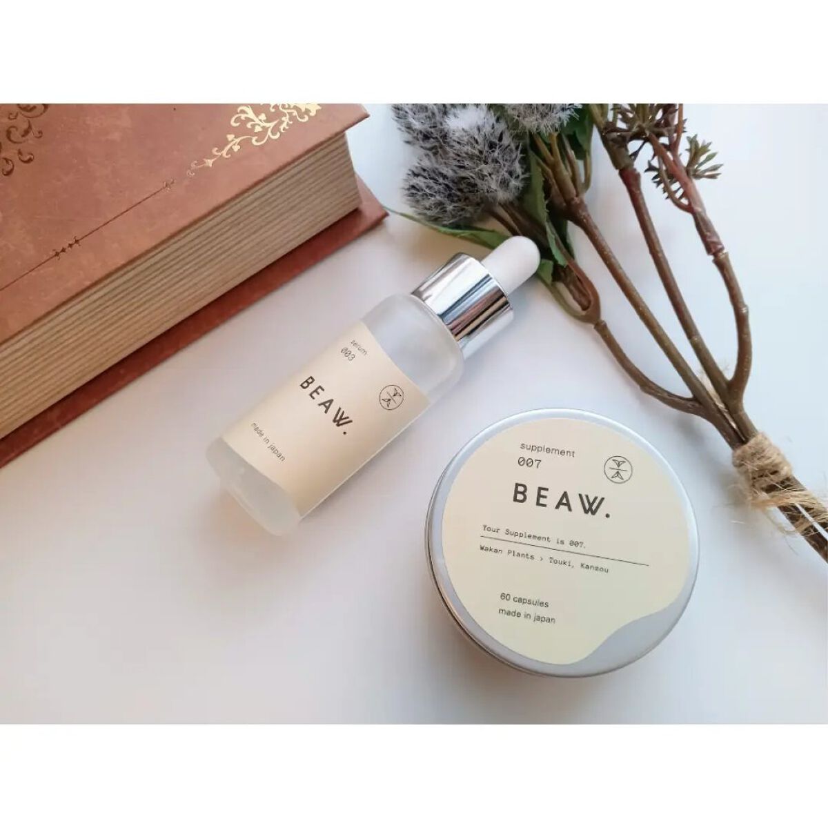 BEAW. スターターボックス17問の質問に答えるだけで、自分専用のサプリメントと美容液の組み合わせを処方してくれます🥰 BEAW. リッチセラムさまざまな肌悩みのタイプに応じて、国産の和漢由来成分を贅沢に配合。 新鮮な美容成分を肌に届けるためにBEAW.は2剤式のセラムを採用。 私はゆるみ肌タイプ。ハリ、シワ、たるみ…今のお肌の状態は、年齢肌がとても気になっているのでピッタリの美容液☺️ ハリや潤いに良さそうなとろみのある美容液✨ BEAW. サプリメント日々の肌調子には、ホルモンバランスの乱れ、からだの冷え、胃腸の不調、ストレスなどさまざまな要因が影響しがち。 肌の不調につながるさまざまな要因へ、パーソナルに、そしてトータルにアプローチできるサプリメントです。 私は胃腸ダメージタイプ😂 外側だけでなく内側からも今の自分に必要な栄養素を取り入れられるので、1カ月と言う短い期間だけど必要なものを補てとても助かるスターターボックス❤️ また不調が続く時には、是非試したいです☺️✨