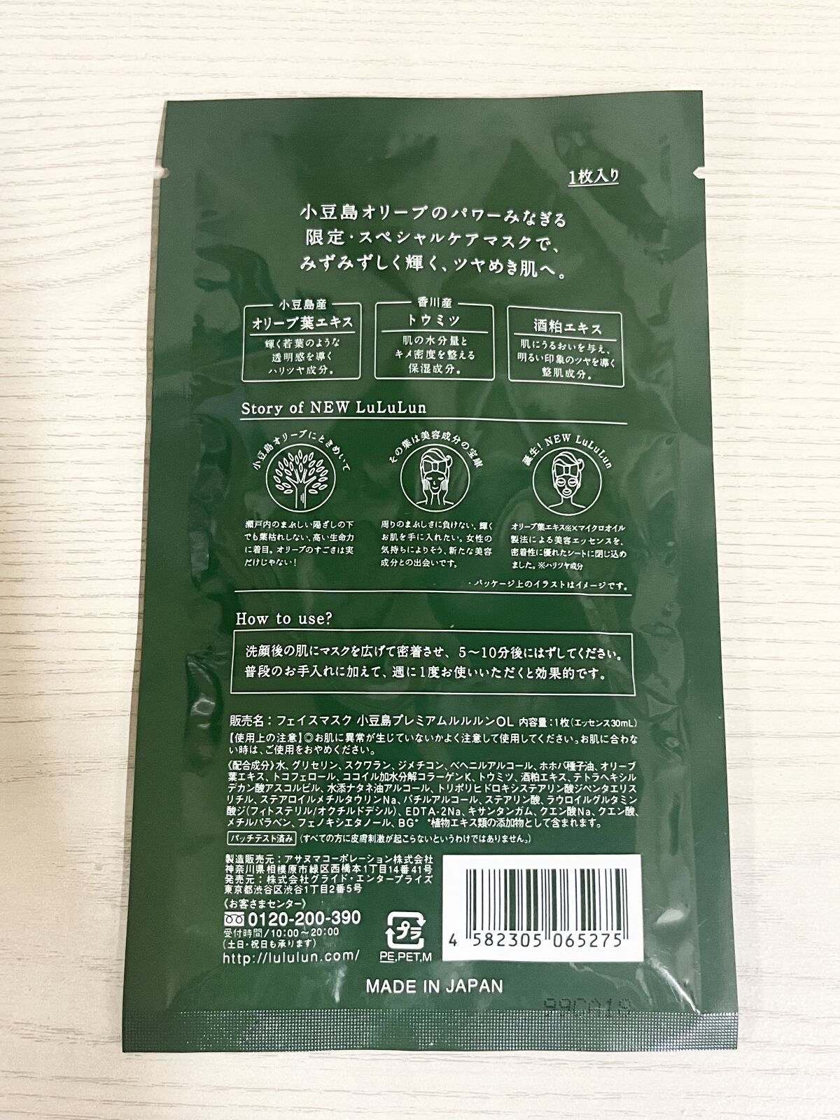 🏷|ルルルン小豆島ルルルンオリーブマスク香川を訪れた際に出会った、ご当地限定のルルルン。シートはやわらかな肌ざわりで、心地よくフィット。乳液のようなとろみのあるエッセンスが肌を包み込み、ゆったりとしたお手入れ時間に。使用後は、しっとりとな...
