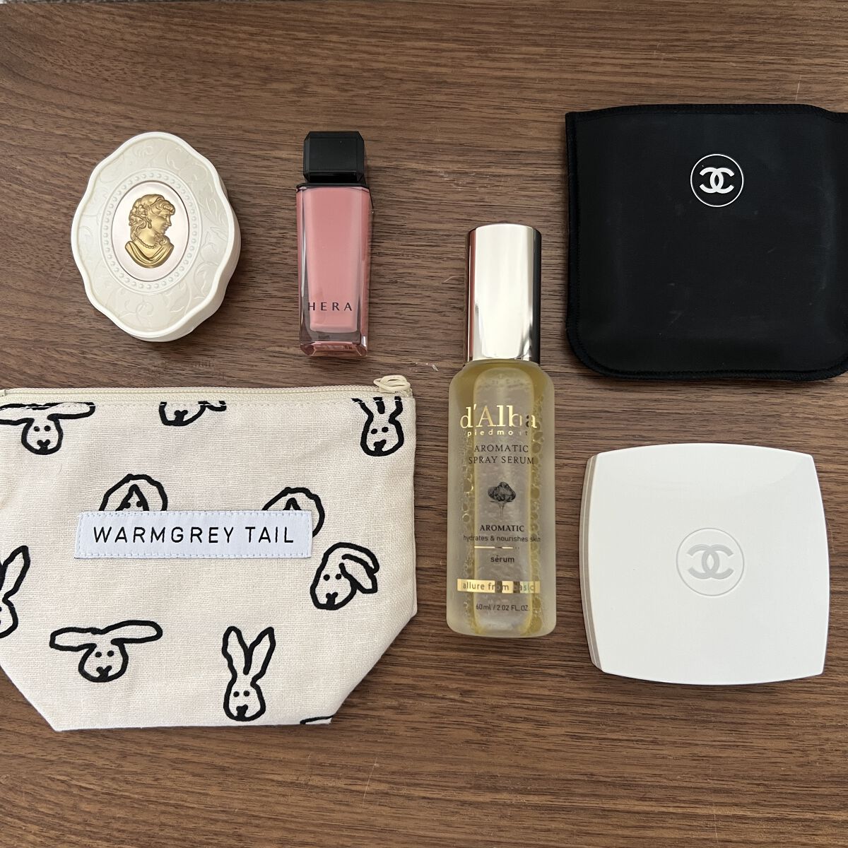 ♡ ファースト…1本は持っておきたい定番ミスト。表面+内部保湿をしてくれる、しっとりツヤ感のある仕上がりです。 ♡アロマティック…ファーストより多い種類のオイルをブレンド。保湿に加えて弾力アップ効果のある、しっとりツヤ感のある仕上がりです。 ♡バイタル…サッパリだけどしっとり仕上がり。お肌の紫外線ダメージ鎮静効果や赤み軽減効果もあるので夏に使いたいミストです。 アロマティックは、持ち運びに便利なミニサイズ(60ml)があるのでお直しポーチにピッタリ♡お直しセットはミニマルかつコンパクト派な私には嬉しいサイズ感です。