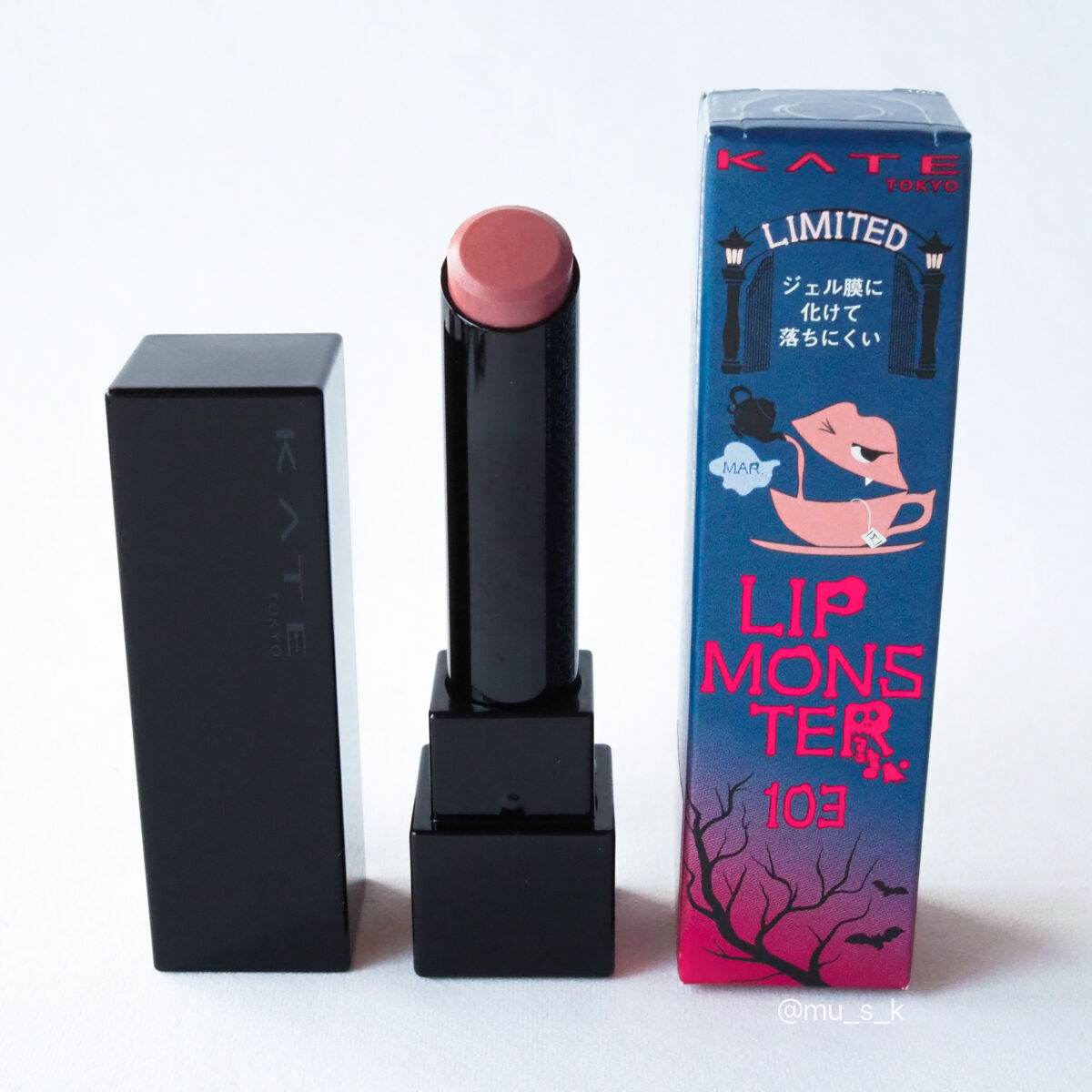 KATEリップモンスター103秘めた炎限定復刻のときに購入しました!リップモンスター3本目です。手の平にのせると黄みよりのニュートラルピンクなのに、実際に唇にのせてみると青みよりに見えます…。重ねれば重ねるほど青みが強くなる印象です。おそらく...