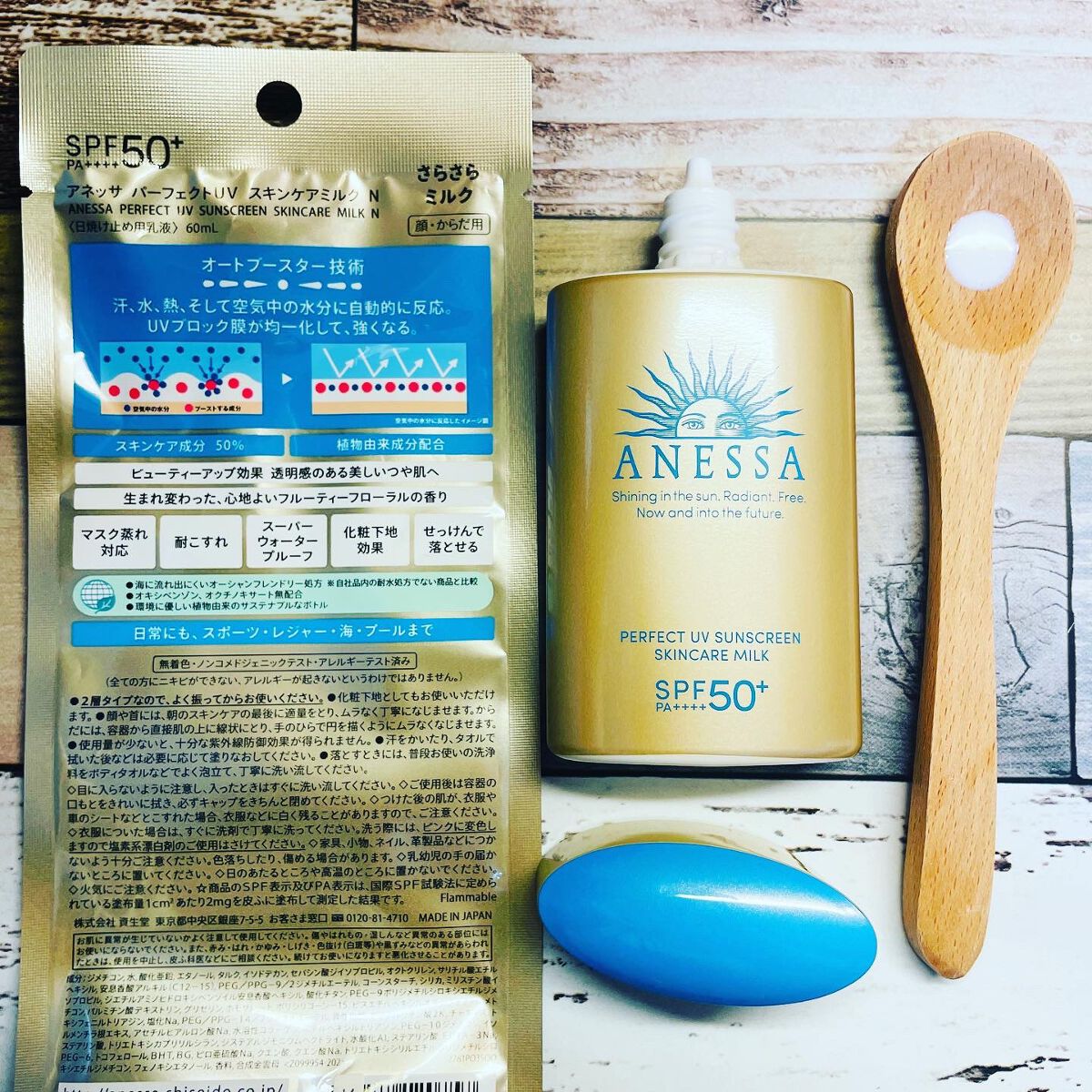 - 顔・からだ用 SPF50+ ・ PA++++ 汗、水、熱、そして空気中の水分に反応してUVブロック膜が強くなる技術搭載 最強※8 UVスキンケアミルク ※8 「最強」とはSPF50+・PA++++、及びアネッサ内ウォータープルーフ効果を意味する。 〇汗・水・熱、そして空気中の水分に自動的に反応して、UVブロック膜が強くなります。-オートブースター技術 〇透明美肌仕上げ-ビューティーアップ効果 “ビューティーアップ粉末”を新配合透明感のある美しいつや肌へ ○スキ ン ケア成 分 50% 配合 〇植物由来成分をブレンドした、紫外線による 乾燥 ダメージを防 ぐ 、うるおいを与える保湿美肌成分 黄花エキス、緑茶エキス、異性化糖、グリセリン 〇保湿 成分 コラーゲン、 スーパーヒアルロン酸※ 9 、 グリセリン ※9 アセチルヒアルロン 酸 Na 〇保湿持続 効果 ○スーパーウォータープルーフ 〇マスク蒸れ対応 〇耐こすれ ○化粧下地効果 ○せっけんで落とせ る 〇さらさらミルク ○生まれ変わった 、 心地よいフルーティーフローラルの香り 〇大気中に浮遊する微粒子、 PM2 .5 などから肌を保護 し ま す。-微粒子付着防止対応 ○砂が肌 につきにくいサンドプルーフ効果 〇海に流れ出にくいオーシャンフレンドリー処方※6 ※6 自社品内の耐水処方でない商品と比較 ○環境に優しいサステナブルなボトル ○植物由来の原料を一部使用した袋 〇オキシベンゾン 、 オクチノキサート無配合 ○無着色・ ノンコメドジェニックテスト・ アレルギーテスト済み (全ての方にニキビができない、アレルギ ーが起きないというわ けではありません)