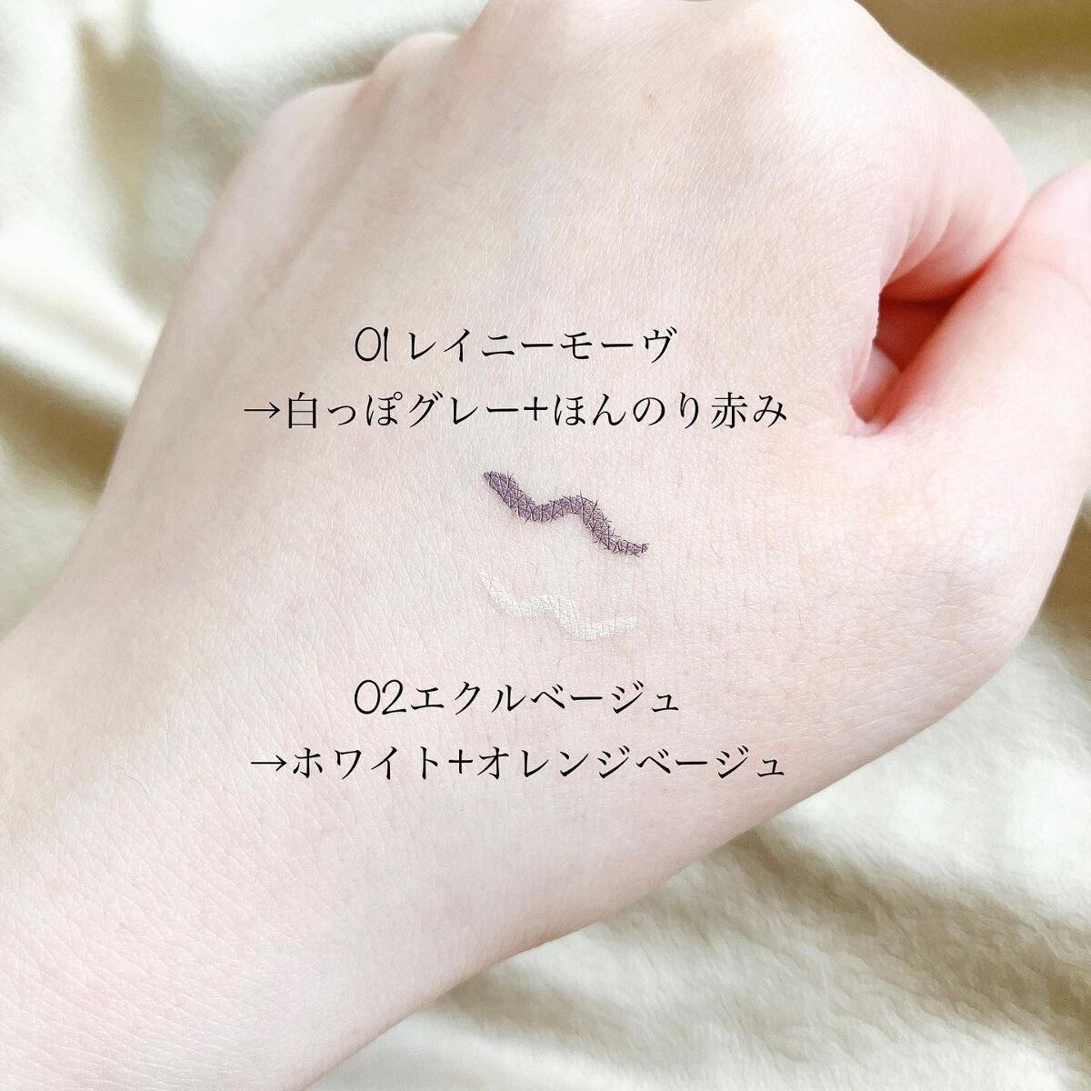 - 【01 レイニーモーヴ】 水、(スチレン/アクリレーツ)コポリマーアンモニウム、BG、炭、1,2-ヘキサンジオール、ベヘネス-25、パンテノール、センブリエキス、ヒアルロン酸Na、ポリアスパラギン酸Na、ペンチレングリコール、フェノキシエタノール、水酸化Al、アクリレーツコポリマー、グリセリン、ベントナイト、ジラウロイルグルタミン酸リシンNa、エチルヘキシルグリセリン、カプリリルグリコール、ベヘネス-30、水酸化K、EDTA-2Na、エタノール、酸化チタン、酸化鉄、赤226 【02 エクルベージュ】 水、(スチレン/アクリレーツ)コポリマーアンモニウム、BG、1,2-ヘキサンジオール、ベヘネス-25、ポリアスパラギン酸Na、パンテノール、センブリエキス、ヒアルロン酸Na、ペンチレングリコール、フェノキシエタノール、水酸化Al、ベントナイト、エチルヘキシルグリセリン、カプリリルグリコール、ベヘネス-30、EDTA-2Na、エタノール、酸化チタン、酸化鉄