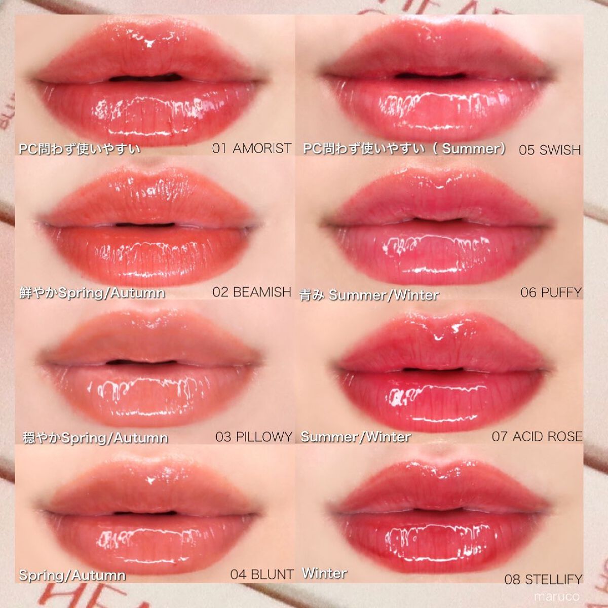 - <01 アモリスト(AMORIST)> リンゴ酸ジイソステアリル、ジフェニルシロキシフェニルトリメチコン、水、ジフェニルジメチコン、ビスジグリセリルポリアシルアジペート-2、水添ポリイソブテン、ポリグリセリン-3、ポリソルベート60、セチルPEG/PPG-10/1ジメチコン、イソステアリン酸ソルビタン、BG、ペンチレングリコール、1,2-ヘキサンジオール、ジメチコン、(アクリル酸ヒドロキシエチル/アクリロイルジメチルタウリンNa)コポリマー、セテアレス-20、スクワラン、黄5、エチルヘキシルグリセリン、香料、赤227、赤104(1)、リナロール、青1、ヘキシルシンナマル、リモネン、ホホバ種子油、アンズ核油、ツバキ種子油、トコフェロール <02 ビーミッシュ(BEAMISH)> リンゴ酸ジイソステアリル、ジフェニルシロキシフェニルトリメチコン、水、ビスジグリセリルポリアシルアジペート-2、ジフェニルジメチコン、水添ポリイソブテン、ポリグリセリン-3、ポリソルベート60、セチルPEG/PPG-10/1ジメチコン、イソステアリン酸ソルビタン、BG、1,2-ヘキサンジオール、ジメチコン、ペンチレングリコール、(アクリル酸ヒドロキシエチル/アクリロイルジメチルタウリンNa)コポリマー、セテアレス-20、スクワラン、酸化チタン、黄5、エチルヘキシルグリセリン、香料、赤227、赤104(1)、リナロール、水酸化Al、ポリアクリル酸アンモニウム、フェノキシエタノール、ヘキシルシンナマル、リモネン、アンズ核油、ツバキ種子油、ホホバ種子油、トコフェロール <03 ピロウィ(PILLOWY)> リンゴ酸ジイソステアリル、ジフェニルシロキシフェニルトリメチコン、水、ビスジグリセリルポリアシルアジペート-2、ジフェニルジメチコン、水添ポリイソブテン、ポリグリセリン-3、ポリソルベート60、セチルPEG/PPG-10/1ジメチコン、イソステアリン酸ソルビタン、BG、ジメチコン、ペンチレングリコール、1,2-ヘキサンジオール、(アクリル酸ヒドロキシエチル/アクリロイルジメチルタウリンNa)コポリマー、セテアレス-20、スクワラン、酸化チタン、エチルヘキシルグリセリン、黄5、香料、赤104(1)、水酸化Al、ポリアクリル酸アンモニウム、赤227、リナロール、フェノキシエタノール、青1、ヘキシルシンナマル、リモネン、アンズ核油、ツバキ種子油、ホホバ種子油、トコフェロール <04 ブラント(BLUNT)> リンゴ酸ジイソステアリル、ジフェニルシロキシフェニルトリメチコン、水、ビスジグリセリルポリアシルアジペート-2、ジフェニルジメチコン、水添ポリイソブテン、ポリグリセリン-3、ポリソルベート60、セチルPEG/PPG-10/1ジメチコン、イソステアリン酸ソルビタン、BG、1,2-ヘキサンジオール、ジメチコン、ペンチレングリコール、(アクリル酸ヒドロキシエチル/アクリロイルジメチルタウリンNa)コポリマー、セテアレス-20、スクワラン、酸化チタン、黄5、エチルヘキシルグリセリン、香料、赤227、水酸化Al、ポリアクリル酸アンモニウム、リナロール、フェノキシエタノール、青1、ヘキシルシンナマル、リモネン、ホホバ種子油、アンズ核油、ツバキ種子油、トコフェロール <05 スウィッシュ(SWISH)> リンゴ酸ジイソステアリル、ジフェニルシロキシフェニルトリメチコン、水、ビスジグリセリルポリアシルアジペート-2、ジフェニルジメチコン、水添ポリイソブテン、ポリグリセリン-3、ポリソルベート60、セチルPEG/PPG-10/1ジメチコン、イソステアリン酸ソルビタン、BG、ジメチコン、ペンチレングリコール、1,2-ヘキサンジオール、(アクリル酸ヒドロキシエチル/アクリロイルジメチルタウリンNa)コポリマー、酸化チタン、セテアレス-20、スクワラン、エチルヘキシルグリセリン、黄5、香料、赤227、黄4、水酸化Al、ポリアクリル酸アンモニウム、赤104(1)、リナロール、フェノキシエタノール、青1、ヘキシルシンナマル、リモネン、アンズ核油、ツバキ種子油、ホホバ種子油 <06 パフィ(PUFFY)> リンゴ酸ジイソステアリル、ジフェニルシロキシフェニルトリメチコン、水、ジフェニルジメチコン、ビスジグリセリルポリアシルアジペート-2、水添ポリイソブテン、ポリグリセリン-3、ポリソルベート60、セチルPEG/PPG-10/1ジメチコン、イソステアリン酸ソルビタン、BG、1,2-ヘキサンジオール、ペンチレングリコール、ジメチコン、(アクリル酸ヒドロキシエチル/アクリロイルジメチルタウリンNa)コポリマー、セテアレス-20、スクワラン、酸化チタン、エチルヘキシルグリセリン、赤227、香料、黄5、水酸化Al、赤104(1)、ポリアクリル酸アンモニウム、リナロール、黄4、フェノキシエタノール、ヘキシルシンナマル、リモネン、ホホバ種子油、アンズ核油、ツバキ種子油、トコフェロール <07 アシッドローズ(ACID ROSE)> リンゴ酸ジイソステアリル、ジフェニルシロキシフェニルトリメチコン、水、ビスジグリセリルポリアシルアジペート-2、ジフェニルジメチコン、水添ポリイソブテン、ポリグリセリン-3、ポリソルベート60、セチルPEG/PPG-10/1ジメチコン、イソステアリン酸ソルビタン、BG、1,2-ヘキサンジ