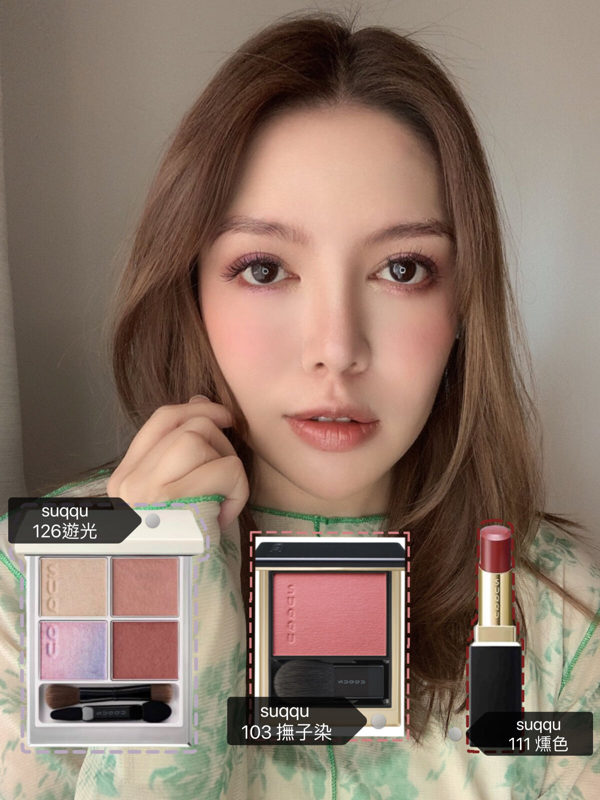 艶やかに咲く春の花々や景色が描かれた '花屏風'の色彩に着想されたSUQQUの春コレクション 大人のピンクベージュパレット。左上: サテンベージュ(上品なツヤ感) 薄膜で密着し、重ねてもムラにならず、ラメ落ちしにくい。パウダーレスな質感で肌と一体化。