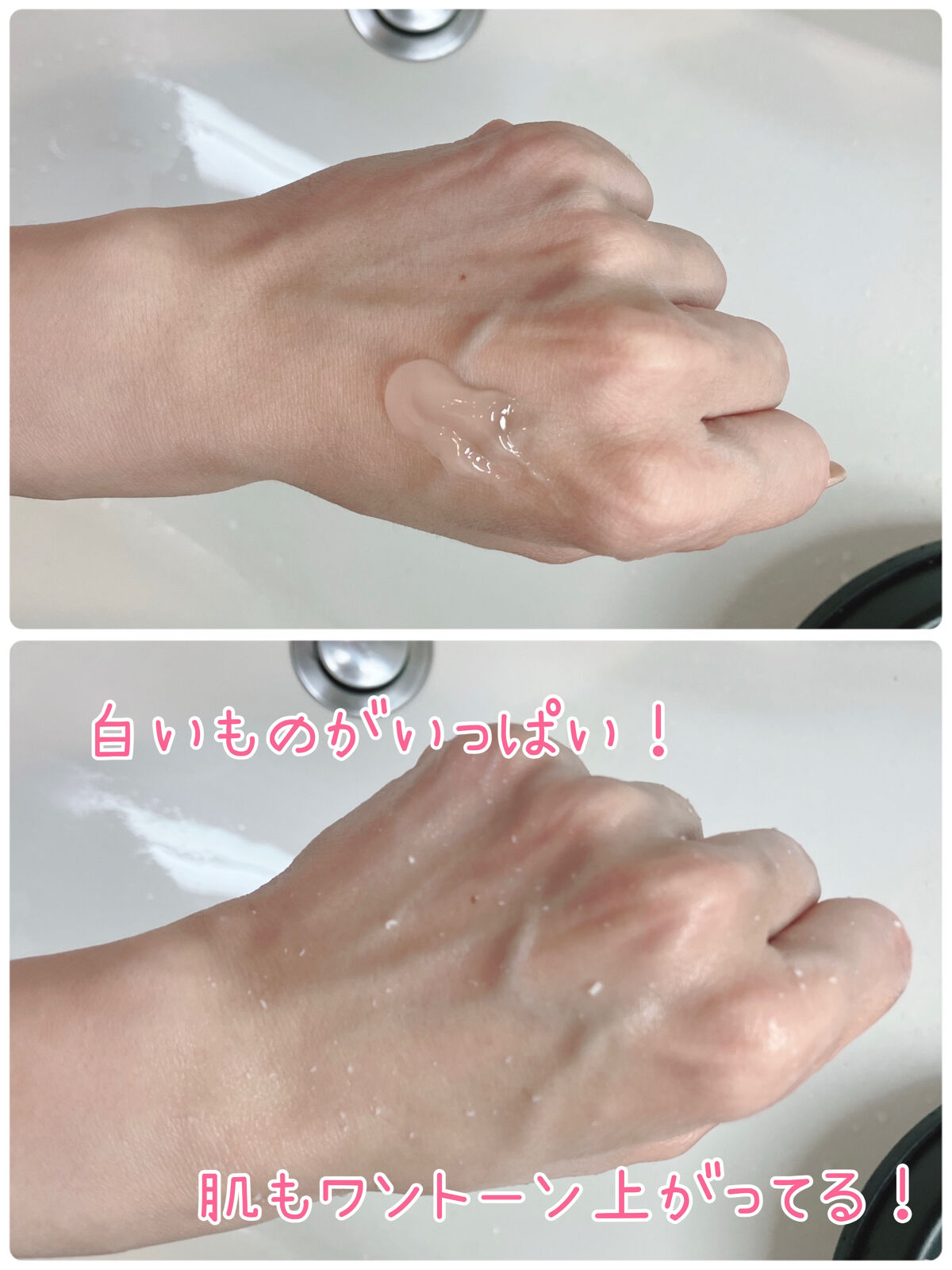 柔らかいジェルで刺激を感じず、マッサージしているとポロポロになり古い角質も絡めとりながらつるすべ肌に導いてくれる! 柔らかいジェルなので、スクラブとかだと刺激が心配だなって方も安心して使える🥰 保湿成分も配合で使用後はしっとりする感じがしました! 手の甲の半分使って比較すると、使ったところはワントーンアップしたような明るい肌になった気がします💓
