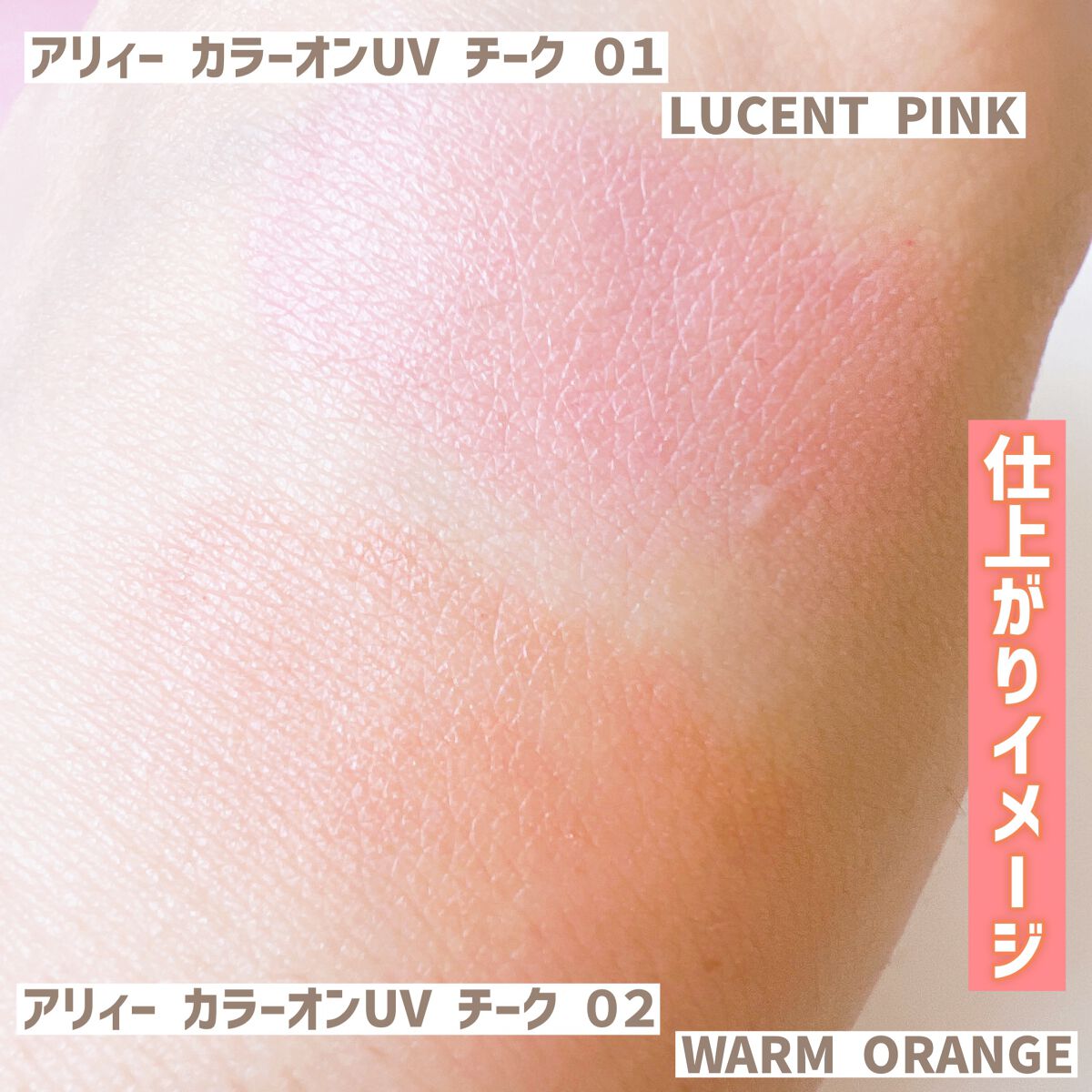 - ◆紫外線を浴びやすい、頬に使えるチークUV/鼻・頬に使える追いツヤUV ◆メイクの上から塗り直しとしても使える。 ◆汗・皮脂 マスクやタオルなどのこすれにも強く落ちにくい。 ◆「カラーUVヴェール技術」で、ベースメイクと混ざりにくく均一に密着。 SPF50+と感触の良さはそのままに素肌を活かした自然な色づきを両立! ◆8時間色持ち データ取得済み ※アリィー調べ。効果には個人差があります。 <基本情報> ・強力UV カット(SPF50+・PA++++) ・フリクションプルーフ:タオルやマスク等のこすれにも強く、落ちにくい ・スーパーウォータープルーフ:汗・水に抜群※²に強い機能 ※² アリィー商品内において LUCENT PINK(チーク 01) 自然に色づき血色感仕上がりの‟透け感ピンク” パッケージもピンクで、ポーチの中も華やぐメイクアイテムです WARM ORANGE(チーク 02) ヘルシーな血色感仕上げの‟じんわりオレンジ” じんわ~りと血色感を与えてくれるから、素肌を活かした自然な仕上がりに TRANSLUCENT(ラスター) ツヤ感を演出する‟シマーカラー” 鼻や頬にハイライトとして使うことで長時間ツヤが持続します