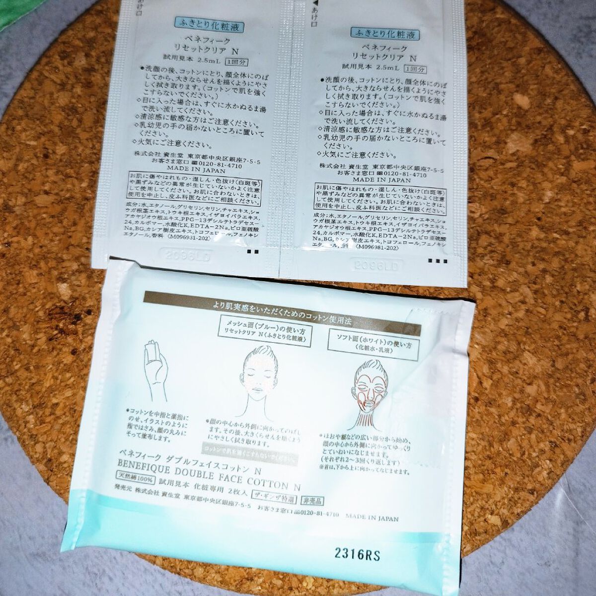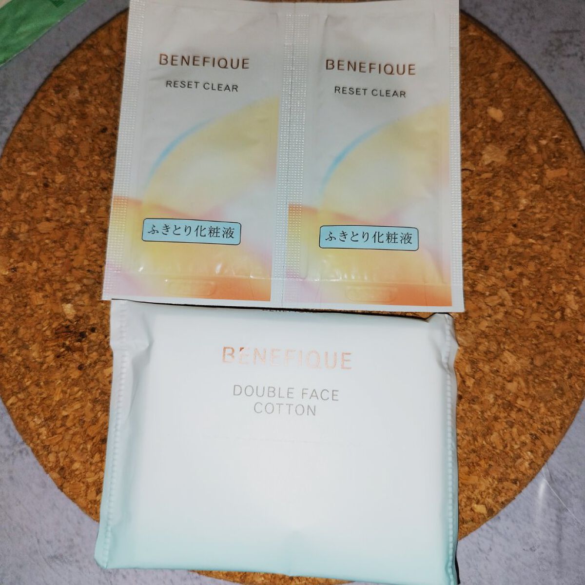 🌱BENEFIQUE 【リセットクリアN】ふきとり化粧水のサンプルを貰ったので、朝晩使ってみました。▶️洗顔後、最初に使うスキンケア💛少しとろみのある液体で、専用コットン(青い面)を使用して肌を撫でるように拭き取る。拭き終わると、ツルツルさら...
