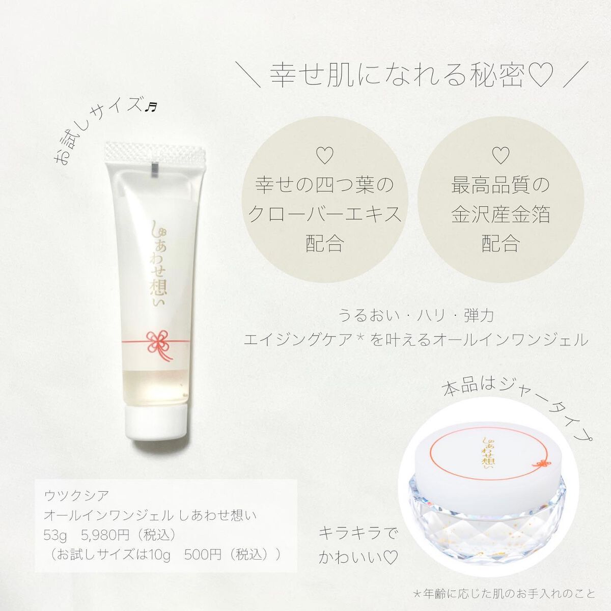 - オールインワンジェル『しあわせ想い』は、幸せのシンボルである四つ葉のクローバーから作られた成分*や、金沢産の高級金箔を配合。時短・美・幸運と、高品質スキンケア化粧品でありながら【縁起物】としての要素をプラスした、すっぴん笑顔が輝くスキンケア化粧品です。また3D形状記憶ジェル**によりお肌にハリを与え、高い弾力性を発揮。さらに独自処方成分により角質層への保湿成分の浸透力をサポートします。 *シロツメクサエキス(保湿成分) **形状を変化させても元の状態に戻るジェル