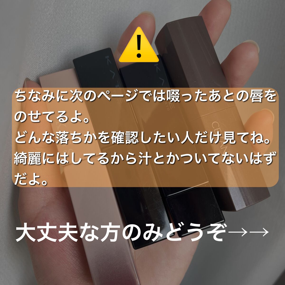 落ちないっていっても結局食べると落ちる物が多いのでこの検証ありがたいです。参考にさせていただきます^_^ またお手持ちの最新リップで検証希望です!ぜひご検討ください🙏