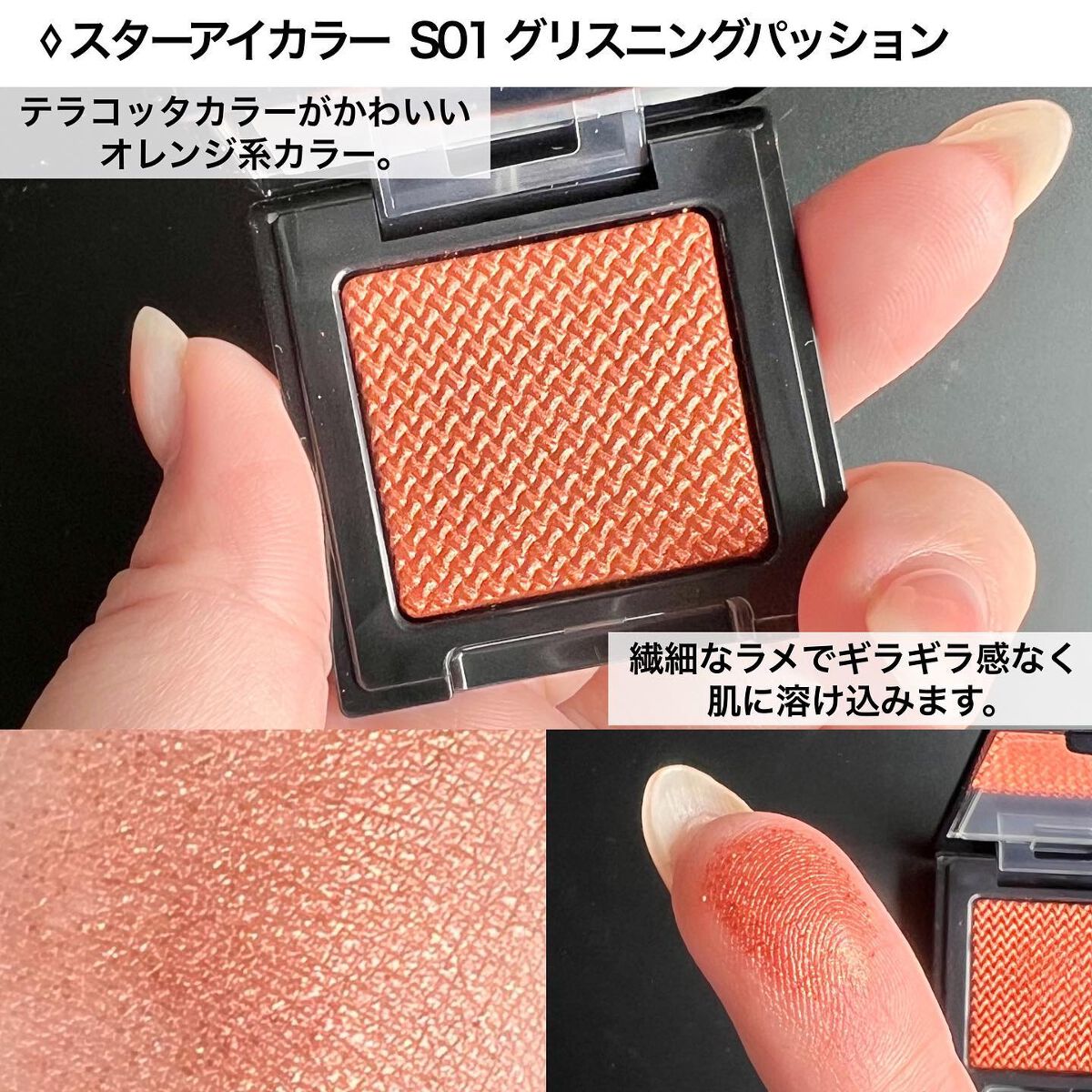 - 01 Deep emotion タルク・シリカ・ミネラルオイル・水添ポリイソブテン・ナイロン-12・(ビニルジメチコン/メチコンシルセスキオキサン)クロスポリマー・オレンジ果皮油・サンショウ果皮エキス・ザクロ果皮エキス・トコフェロール・BG・エタノール・ジメチコン・セスキステアリン酸ソルビタン・メチコン・合成ワックス・水・クロルフェネシン・香料・グンジョウ・マイカ・酸化チタン・酸化亜鉛・酸化鉄・硫酸Ba・黄4・赤202・赤226 02 Swag ホウケイ酸(Ca/Na)・シリカ・ホウケイ酸(Ca/Al)・テトラ(ヒドロキシステアリン酸/イソステアリン酸)ジペンタエリスリチル・ミリスチン酸オクチルドデシル・ジメチコン・スクワラン・ステアリン酸Mg・オレンジ果皮油・サンショウ果皮エキス・ザクロ果皮エキス・トコフェロール・BG・エタノール・酸化スズ・水・クロルフェネシン・デヒドロ酢酸Na・香料・グンジョウ・マイカ・酸化チタン・酸化鉄・黄4・青1 03 Snazzy タルク・リンゴ酸ジイソステアリル・シリカ・ジメチコン・ワセリン・ジエチルヘキサン酸ネオペンチルグリコール・ミリスチン酸亜鉛・オレンジ果皮油・サンショウ果皮エキス・ザクロ果皮エキス・トコフェロール・BG・エタノール・セスキイソステアリン酸ソルビタン・水・クロルフェネシン・デヒドロ酢酸Na・香料・グンジョウ・マイカ・酸化チタン・酸化鉄 04 Red sand ホウケイ酸(Ca/Na)・タルク・イソステアリン酸グリセリズ・エチルヘキサン酸セチル・ジメチコン・スクワラン・イソステアリン酸ソルビタン・水酸化Al・シリカ・ステアリン酸Mg・ヒドロキシステアリン酸エチルヘキシル・ナイロン-12・オレンジ果皮油・サンショウ果皮エキス・ザクロ果皮エキス・トコフェロール・BG・エタノール・エチルヘキシルグリセリン・酸化スズ・水・メチルパラベン・香料・マイカ・酸化チタン・酸化鉄・赤226 05 Sparkling ジメチコン・ホウケイ酸(Ca/Al)・タルク・(ジメチコン/ビニルジメチコン)クロスポリマー・合成フルオロフロゴパイト・トリ(カプリル酸/カプリン酸)グリセリル・オレンジ果皮油・サンショウ果皮エキス・ザクロ果皮エキス・トコフェロール・BG・エタノール・カルナウバロウ・ラウロイルリシン・酸化スズ・水・クロルフェネシン・デヒドロ酢酸Na・香料・グンジョウ・マイカ・酸化チタン・酸化鉄 06 Amber ジメチコン・ホウケイ酸(Ca/Al)・タルク・合成フルオロフロゴパイト・トリ(カプリル酸/カプリン酸)グリセリル・(ジメチコン/ビニルジメチコン)クロスポリマー・オレンジ果皮油・サンショウ果皮エキス・ザクロ果皮エキス・トコフェロール・BG・エタノール・カルナウバロウ・ラウロイルリシン・酸化スズ・水・クロルフェネシン・デヒドロ酢酸Na・香料・グンジョウ・マイカ・酸化チタン・酸化鉄 07 Nightowl 合成金雲母・トリエチルヘキサノイン・トリメリト酸トリトリデシル・タルク・ジメチコン・ワセリン・ホウケイ酸(Ca/Al)・セスキイソステアリン酸ソルビタン・オレンジ果皮油・サンショウ果皮エキス・ザクロ果皮エキス・BG・エタノール・酸化スズ・水・水添ポリイソブテン・香料・(PET/ポリメタクリル酸メチル)ラミネート・グンジョウ・マイカ・酸化チタン・酸化亜鉛・酸化鉄 08 Disco ball タルク・シリカ・ホホバ種子油・合成フルオロフロゴパイト・リンゴ酸ジイソステアリル・ジフェニルシロキシフェニルトリメチコン・ワセリン・イソステアリン酸ソルビタン・1,2-ヘキサンジオール・オレンジ果皮油・サンショウ果皮エキス・ザクロ果皮エキス・トコフェロール・BG・イソドデカン・エタノール・ジメチコン・酸化スズ・水・水酸化Al・メチルパラベン・香料・マイカ・酸化チタン・酸化鉄 09 Holic タルク・合成金雲母・ジメチコン・ナイロン-12・シリカ・ミネラルオイル・メチコン・(ビニルジメチコン/メチコンシルセスキオキサン)クロスポリマー・オレンジ果皮油・サンショウ果皮エキス・ザクロ果皮エキス・トコフェロール・BG・BHT・エタノール・スクワラン・ヘキサ(ヒドロキシステアリン酸/ステアリン酸/ロジン酸)ジペンタエリスリチル・ミツロウ・ワセリン・合成ワックス・水・クロルフェネシン・香料・グンジョウ・マイカ・マンガンバイオレット・酸化亜鉛・酸化鉄・赤202 10 Light ray ホウケイ酸(Ca/Na)・タルク・イソステアリン酸グリセリズ・エチルヘキサン酸セチル・ジメチコン・スクワラン・イソステアリン酸ソルビタン・シリカ・ステアリン酸Mg・ヒドロキシステアリン酸エチルヘキシル・ナイロン-12・オレンジ果皮油・サンショウ果皮エキス・ザクロ果皮エキス・トコフェロール・BG・エタノール・エチルヘキシルグリセリン・酸化スズ・水・メチルパラベン・香料・コンジョウ・マイカ・酸化チタン・酸化鉄 11 Neon light タルク・シリカ・ジメチコン・ミネラルオイル・ナイロン-12・メチコン・オレンジ果皮油・サンショウ果皮エキス・ザクロ果皮エキス・トコフェロール・BG・BHT・エタノール・ヘキサ(ヒドロキシステアリン酸/ステ