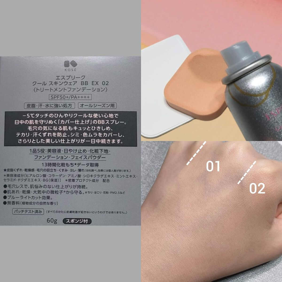 - 限定品 SPF50+ / PA++++ 夏肌を守り抜く「美容液成分」「機能」がパワーアップした、ー5°CタッチのBBスプレー。 毛穴の気になる肌もキュッとひきしめ、毛穴・シミをカバー。毛穴レスで肌悩みのない仕上がりを一日中キープします。 密着力と均一な厚みのある化粧膜で、毛穴を自然にしっかりカバー。 素肌の色でシミ・色ムラをしっかりカバー。 マスクにつきにくく、美しい仕上がりを長時間キープ。 ■ 1品5役(美容液・日やけ止め・化粧下地・ファンデーション・フェイスパウダー) ■ スジやムラができにくく、肌へ均一にしっかりと塗布できる専用スポンジ付き。