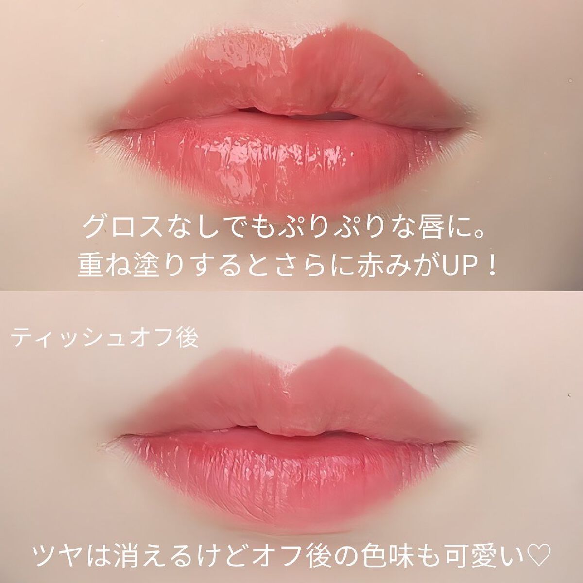 手に出すとベージュ感強めですが、唇に乗せると結構赤みを感じるカラーでした🫶🏻 グロスなしでもぷりぷりな唇に仕上がるので、ツヤ好きさんにはたまらない🤍 時間がたつと内側が赤く濃くなるタイプのティントだったのでしっかりと保湿してからの使用がおすすめです☺︎