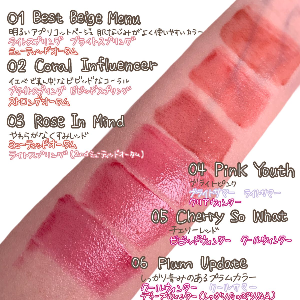 - <01 BEST BEIGE MENU(推し杏子ベージュ)> 水、ジフェニルジメチコン、リンゴ酸ジイソステアリル、ビスジグリセリルボリアシルアジペート-2、水添ポリイソブテン、ダイマー ジリノール酸ダイマージリノレイルビス(ベヘニル/イソステアリル/フィトステリル)、ジグリセリン、セチルPEG/PPG-10/1ジメチコン、DPG、水添ポリ (C6-14 オレフィン)、ポリソルベート60、イソステアリン酸ソルビタン、ダイマージリノール酸ジイソステアリン酸ポリ グリセリル-3、ペンチレングリコール、(アクリル酸ヒドロキシエチル/アクリロイルジメチルタウリンNa)コポリマー、トリ(カプリル酸/ カプリン酸)グリセリル、スクワラン、セテアレス-20、(エチレン/プロピレン)コポリマー、フェノキシエタノール、グリセリン、ポリグリ セリン-3、香料、エチルヘキシルグリセリン、ハマメリス葉エキス、オニユリエキス、BG、酸化チタン、黄5、赤227、赤104(1)、青1 <02 CORAL INFLUENCER(イエベ必須コーラル)> 水、ジフェニルジメチコン、リンゴ酸ジイソステアリル、ビスジグリセリルボリアシルアジペート-2、水添ポリイソブテン、ダイマー ジリノール酸ダイマージリノレイルビス(ベヘニル/イソステアリル/フィトステリル)、ジグリセリン、セチルPEG/PPG-10/1ジメチコン、DPG、水添ポリ (C6-14 オレフィン)、ポリソルベート60、イソステアリン酸ソルビタン、ダイマージリノール酸ジイソステアリン酸ポリ グリセリル-3、ペンチレングリコール、(アクリル酸ヒドロキシエチル/アクリロイルジメチルタウリンNa)コポリマー、トリ(カプリル酸/ カプリン酸)グリセリル、スクワラン、セテアレス-20、(エチレン/プロピレン)コポリマー、フェノキシエタノール、グリセリン、ポリグリ セリン-3、香料、エチルヘキシルグリセリン、ハマメリス葉エキス、オニユリエキス、BG、酸化チタン、黄5、赤227、赤104(1)、青1 <03 ROSE IN MIND(いいねローズ)> 水、ジフェニルジメチコン、リンゴ酸ジイソステアリル、ビスジグリセリルポリアシルアジペート-2、水添ポリイソブテン、ダイマージリノール酸ダイマージリノレイルビス(ベヘニル/イソステアリル/フィトステリル)、ジグリセリン、DPG、セチルPEG/PPG-10/1ジメチコン、水添ポリデセン、ポリソルベート60、イソステアリン酸ソルビタン、ダイマージリノール酸ジイソステアリン酸ポリグリセリル-3、ペンチレングリコール、(アクリル酸ヒドロキシエチル/アクリロイルジメチルタウリンNa)コポリマー、トリ(カプリル酸/カプリン酸)グリセリル、スクワラン、セテアレス-20、(エチレン/プロピレン)コポリマー、フェノキシエタノール、グリセリン、香料、エチルヘキシルグリセリン、ハマメリス葉エキス、オニユリエキス、BG、テトラ(ジ-t-ブチルヒドロキシヒドロケイヒ酸)ペンタエリスリチル、酸化チタン、黄5、赤104(1)、赤227、青1 <04 PINK YOUTH(ベイビー天使)> 水、ジフェニルジメチコン、リンゴ酸ジイソステアリル、ビスジグリセリルボリアシルアジペート-2、水添ポリイソブテン、ダイマー ジリノール酸ダイマージリノレイルビス(ベヘニル/イソステアリル/フィトステリル)、ジグリセリン、セチルPEG/PPG-10/1ジメチコン、DPG、水添ポリ (C6-14オレフィン)、ポリソルベート60、イソステアリン酸ソルビタン、ダイマージリノール酸ジイソステアリン酸ポリ グリセリル-3、ペンチレングリコール、(アクリル酸ヒドロキシエチル/アクリロイルジメチルタウリンNa)コポリマー、トリ(カプリル酸/ カプリン酸)グリセリル、スクワラン、セテアレス-20、(エチレン/プロピレン)コポリマー、フェノキシエタノール、ポリグリセリン-3、香料、エチルヘキシルグリセリン、グリセリン、水酸化Al、ポリアクリル酸アンモニウム、BG、ハマメリス葉エキス、オニユリエキス、酸化チタン、赤227、黄4、赤104 (1) 黄5、青1 <05 CHERRY SO WHAT(どうしたのチェリー)> 水、ジフェニルジメチコン、リンゴ酸ジイソステアリル、ビスジグリセリルポリアシルアジペート-2、水添ポリイソブテン、ダイマージリノール酸ダイマージリノレイルビス(ベヘニル/イソステアリル/フィトステリル)、ジグリセリン、セチルPEG/PPG-10/1ジメチコン、DPG、水添ポリ(C6-14オレフィン)、ポリソルベート60、イソステアリン酸ソルビタン、ダイマージリノール酸ジイソステアリン酸ポリグリセリル-3、ペンチレングリコール、(アクリル酸ヒドロキシエチル/アクリロイルジメチルタウリンNa)コポリマー、トリ(カプリル酸/カプリン酸)グリセリル、スクワラン、セテアレス-20、(エチレン/プロピレン)コポリマー、フェノキシエタノール、ポリグリセリン-3、香料、エチルヘキシルグリセリン、グリセリン、ハマメリス葉エキス、オニユリエキス、BG、赤227、黄4、赤104(1)、黄5、青1 <06 PLUM UPDATE(プロフ写プラム)> 水、ジフェニルジメチコン、リンゴ酸ジイソステアリル、ビスジグリセリルポリアシルアジペート-2、水添ポリイソブテン、ダイマー ジリノール酸ダイマージリノレイルビス(ベヘニル/イソステアリル/フィトステリル)、