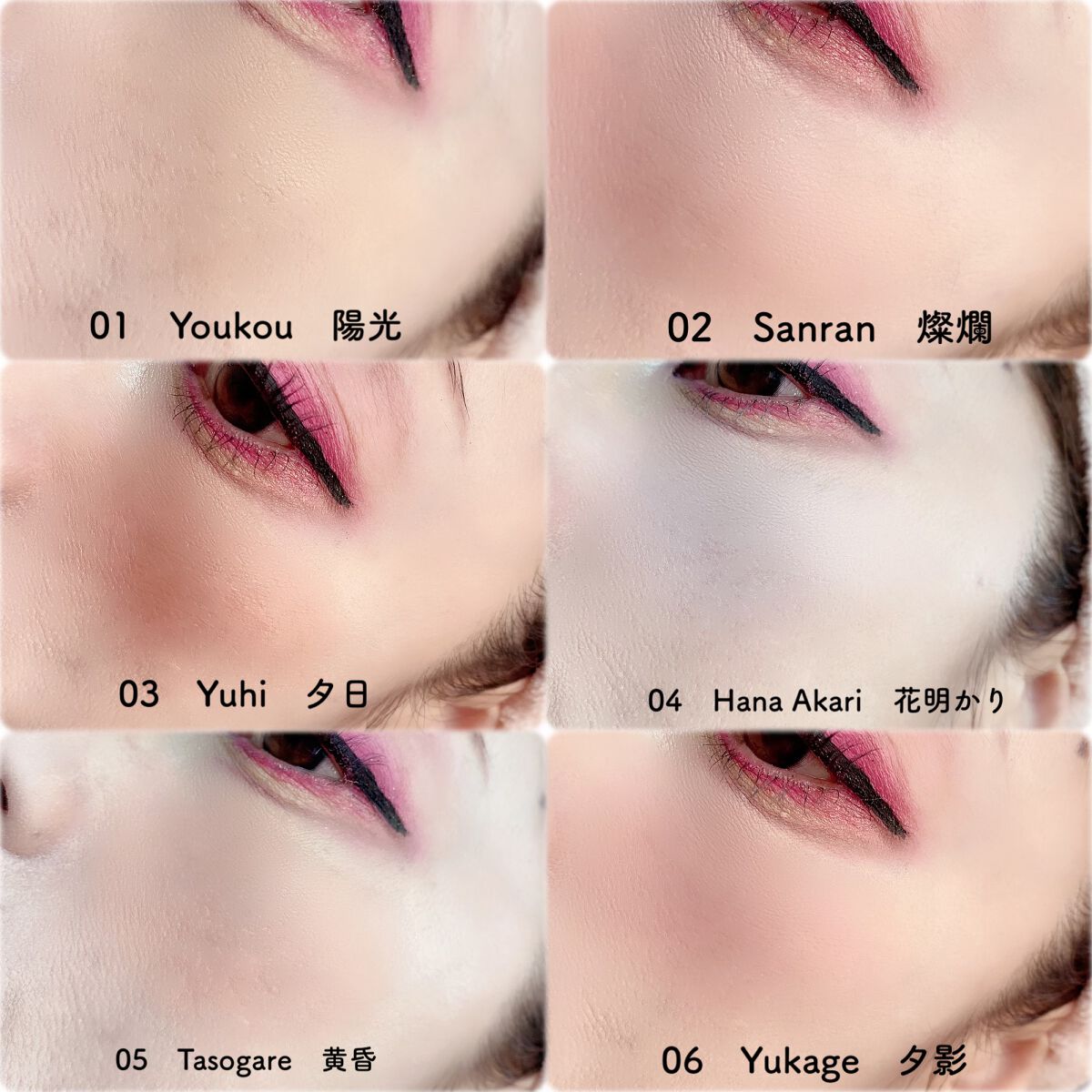 - #01 Youkou マイカ、トリエチルヘキサノイン、シリカ、合成ワックス、リンゴ酸ジイソステアリル、ヘキサ(ヒドロキシステアリン酸/ステアリン酸/ロジン酸)ジペンタエリスリチル、セスキイソステアリン酸ソルビタン、エチルヘキシルグリセリン、メチルパラベン、酢酸トコフェロール、フェノキシエタノール、(+/-)酸化チタン、合成フルオロフロゴパイト、ステアリン酸亜鉛、酸化鉄、黄5、ホウケイ酸(Ca/Na)、赤201、酸化スズ #02 Sanran マイカ、トリエチルヘキサノイン、シリカ、合成ワックス、リンゴ酸ジイソステアリル、ヘキサ(ヒドロキシステアリン酸/ステアリン酸/ロジン酸)ジペンタエリスリチル、セスキイソステアリン酸ソルビタン、エチルヘキシルグリセリン、メチルパラベン、酢酸トコフェロール、フェノキシエタノール、(+/-)酸化チタン、合成フルオロフロゴパイト、ステアリン酸亜鉛、酸化鉄、黄5、ホウケイ酸(Ca/Na)、赤201、酸化スズ #03 Yuhi マイカ、トリエチルヘキサノイン、シリカ、合成ワックス、リンゴ酸ジイソステアリル、ヘキサ(ヒドロキシステアリン酸/ステアリン酸/ロジン酸)ジペンタエリスリチル、セスキイソステアリン酸ソルビタン、エチルヘキシルグリセリン、メチルパラベン、酢酸トコフェロール、フェノキシエタノール、(+/-)酸化チタン、合成フルオロフロゴパイト、ステアリン酸亜鉛、酸化鉄、黄5、ホウケイ酸(Ca/Na)、赤201、酸化スズ #04 Hana Akari マイカ、トリエチルヘキサノイン、タルク、シリカ、カオリン、ヘキサ(ヒドロキシステアリン酸/ステアリン酸/ロジン酸)ジペンタエリスリチル、エチルヘキシルグリセリン、ジメチコン、トリエトキシカプリリルシラン、酢酸トコフェロール、フェノキシエタノール、(+/-)酸化チタン、酸化鉄、赤201、カルミン、黄5 #05 Tasogare マイカ、トリエチルヘキサノイン、タルク、シリカ、カオリン、ヘキサ(ヒドロキシステアリン酸/ステアリン酸/ロジン酸)ジペンタエリスリチル、エチルヘキシルグリセリン、ジメチコン、トリエトキシカプリリルシラン、酢酸トコフェロール、フェノキシエタノール、(+/-)酸化チタン、酸化鉄、赤201、カルミン、黄5 #06 Yukage マイカ、トリエチルヘキサノイン、タルク、シリカ、カオリン、ヘキサ(ヒドロキシステアリン酸/ステアリン酸/ロジン酸)ジペンタエリスリチル、エチルヘキシルグリセリン、ジメチコン、トリエトキシカプリリルシラン、酢酸トコフェロール、フェノキシエタノール、(+/-)酸化チタン、酸化鉄、赤201、カルミン、黄5