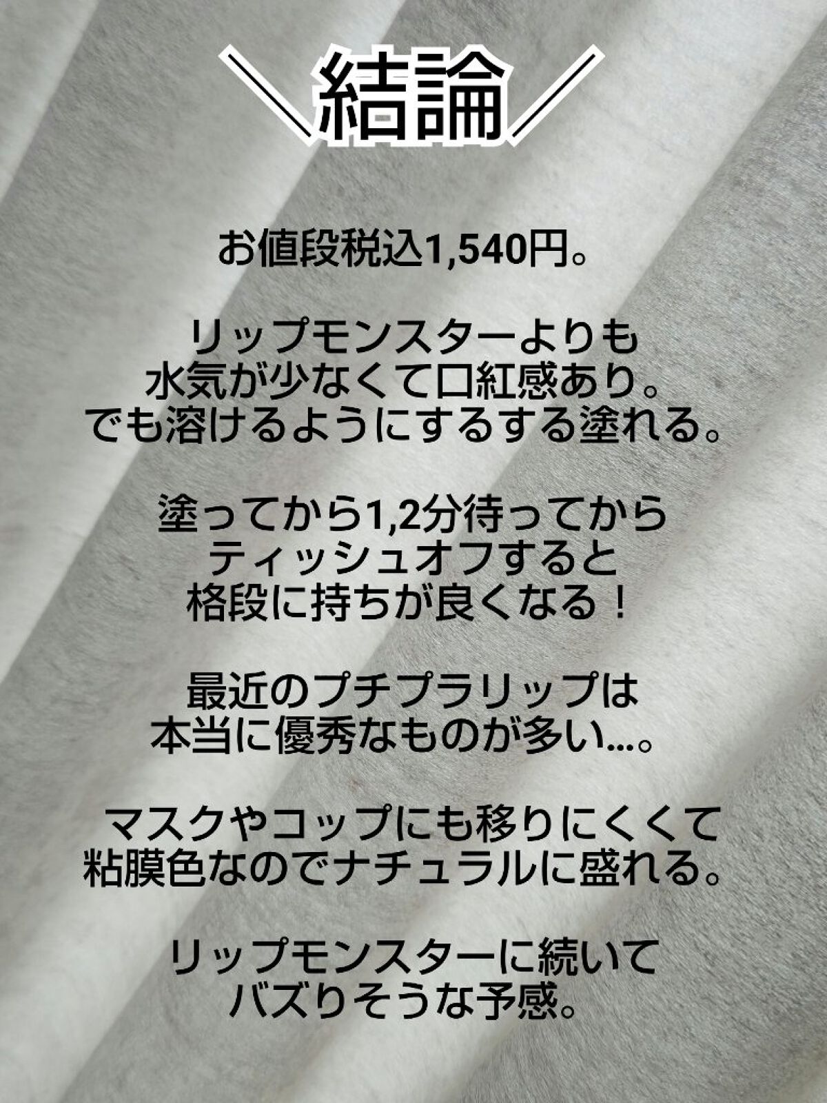 塗り心地は軽くなめらかでリップクリームのよう。 塗って少しおくかティッシュオフ→塗り直しを何度か繰り返すと落ちにくいしマスク移りしにくくて重宝します。 水にもこすれにも強いのにクレンジングではするっと落ちる。 ティントじゃないのにこの色持ち。すごい! 同じ処方同士なので違う色のリップモンスターを重ね塗りしやすいのも楽しい。 違う色のリップモンスターを混ぜるのをミックスモンスターって言うんですって。 可愛いネーミングもたまらない。