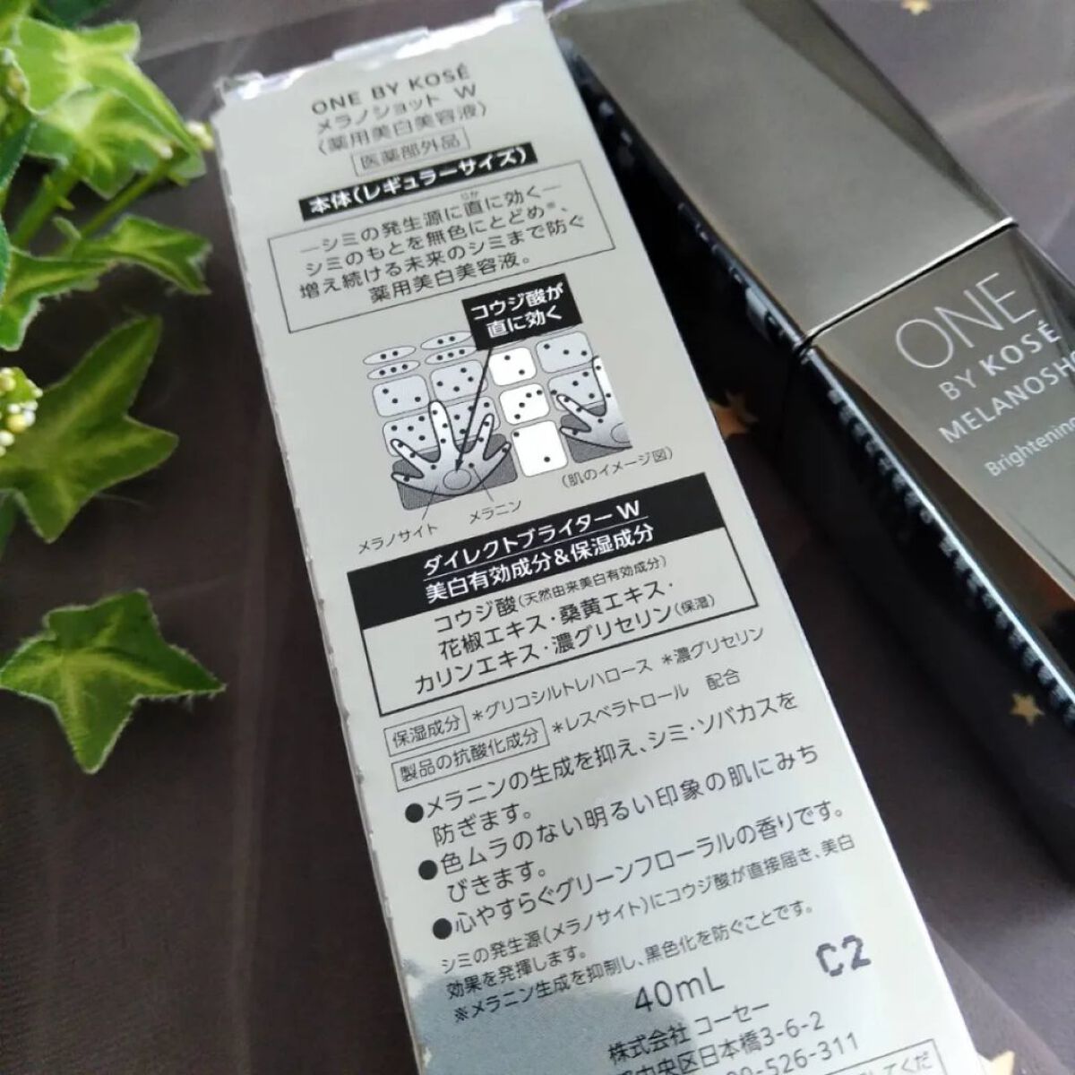 シミ発生源に直に効く 天然由来の美白有効成分 進化したみずみずしい浸透感 ワンバイコーセー メラノショット Wには美白有効成分の「コウジ酸」含まれている ほんの〜りとお上品で素敵な香り ほんのりオレンジ味のあるとろっとしたテクスチャーで、肌馴染みも良くていいです。