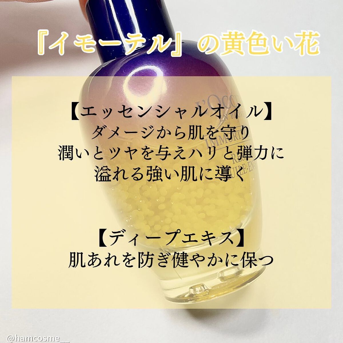 ロクシタンの人気美容液がリニューアル! ボトルの中で輝く黄金のオーガニックのイモーテルエッセンシャルオイルカプセル*使うたびにはじけて新鮮な美容成分を届けてくれるんです。 肌に触れた瞬間、ふわっと広がるイモーテルの香りに贅沢なナイトケアタイムを過ごしているように感じます。 この1本で簡単にプロ級のスキンケアができちゃいます!!