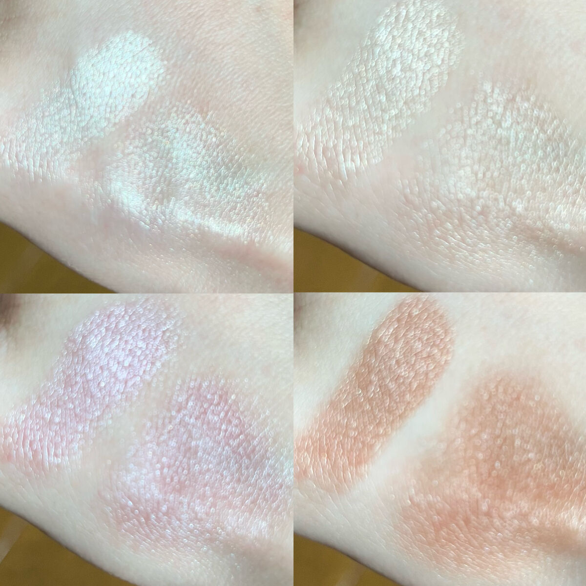 右上のシェーディングが淡めで 鼻筋とか失敗しにくい ラメのハイライトはジェルっぽ質感で しっとりツヤツヤになってとても可愛いけど マットハイライトは肌の粗が出てしまって そこだけが残念 02の方がよりしっかり凹凸が作れるイメージ