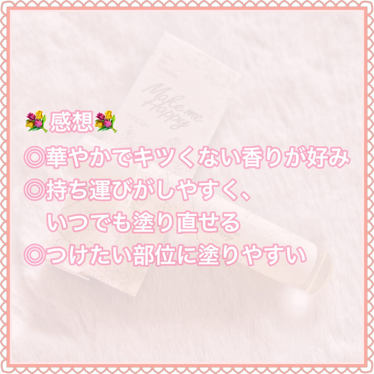 つける量を調整しやすい、ロールオンタイプのオードトワレです。 持ち運びにも便利なサイズ! 正直、「これはちょっと…」っと思うような、きつすぎる香りはなく(個人の意見です笑)、ふわっと香る良い香りがたくさんありました。 メイクミーハッピー オードトワレ WHITE ~白い花束をイメージした柔らかい香り~ 💬柔らかいフローラルの香りで、上品です