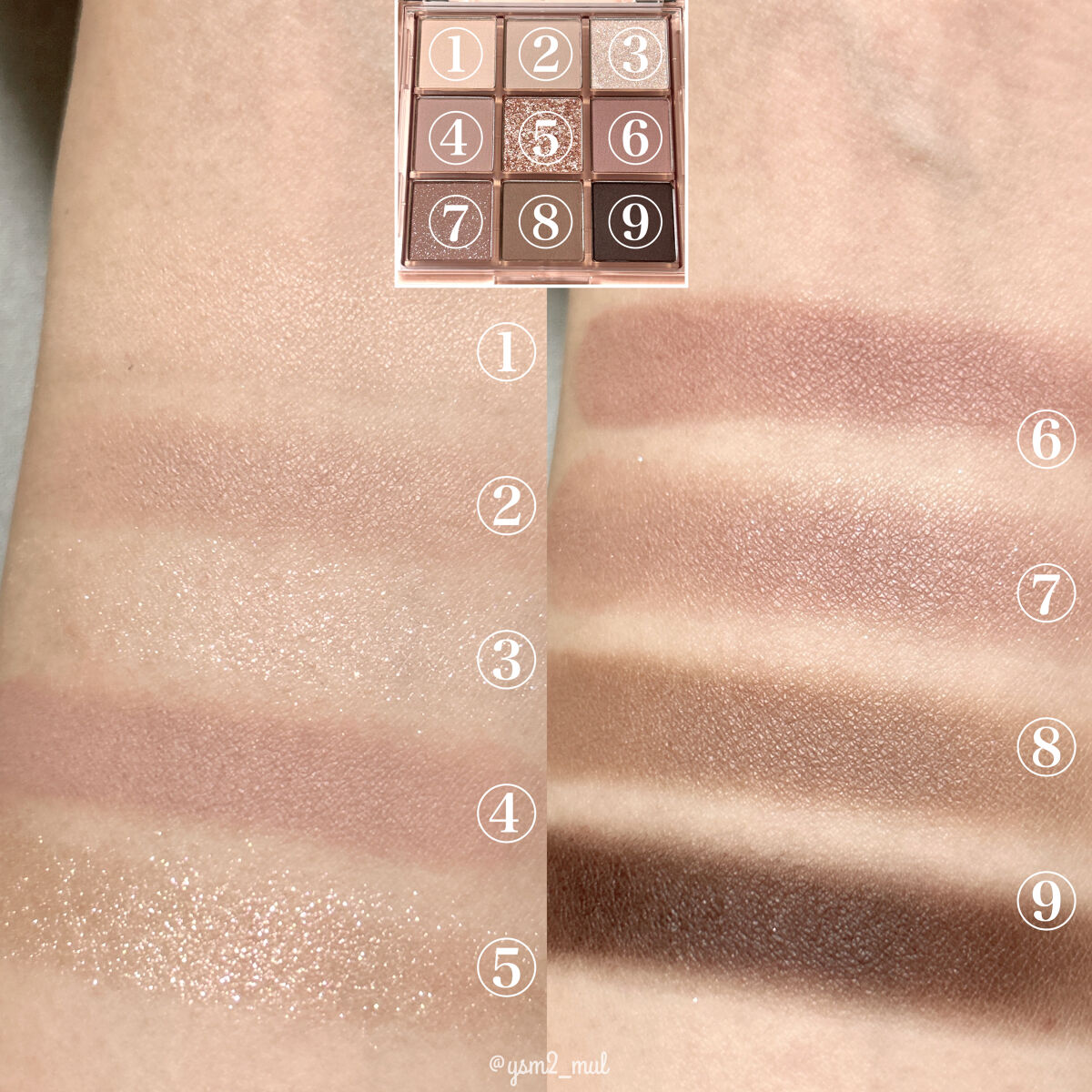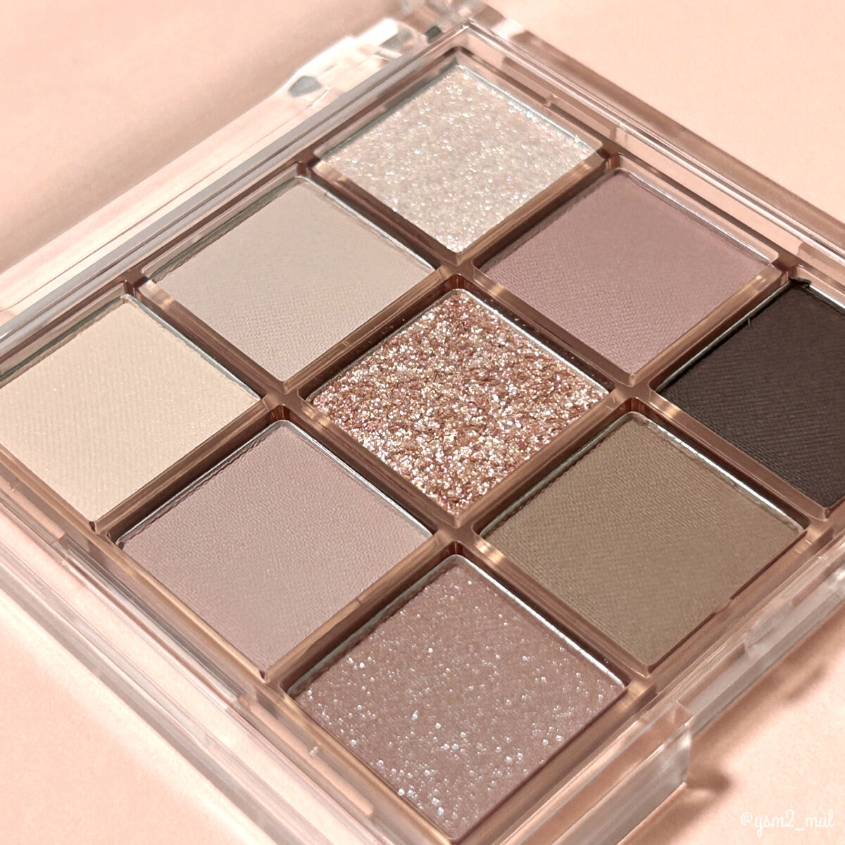 スモーキーでクールな雰囲気のアイパレット! カーキぽいカラーやピンクカラーなど、様々なカラーが入っているので、その日の気分で雰囲気の違うアイメイクを楽しめます! 粉質が凄くしっとりとしていて肌馴染みが良く、 捨て色無しの絶妙な配色がとっても使いやすいです♪ 柔らかくピタッと密着し日差しのように美しく輝くグリッター。 ベース、陰影、グリッターと3つの質感で自分だけのレイヤリング演出ができる。