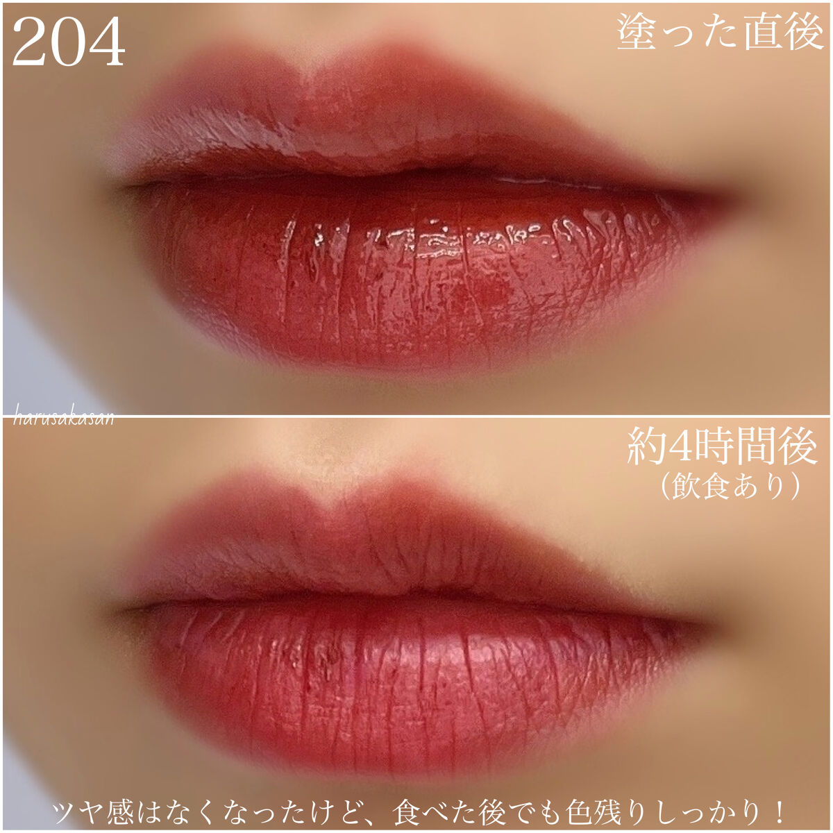 ザクザクの偏光ラメが入ってて強い! 使いやすい色味で可愛い〜! ぷるんとしたツヤができて美味しそうな唇になる! ツヤタイプのみずみずしい発色のティントリップ💄 ティッシュオフしたらほとんどマスクにつかない! あとツヤもおさまるけど、 くすみ感が落ち着くので使いやすい◎