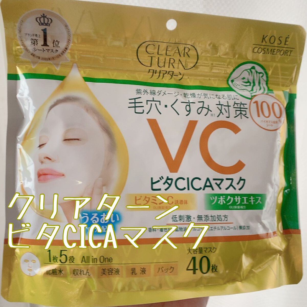 クリアターンビタCICAマスク☑︎1枚5役(化粧水、パック、乳液、美容液、収れん)☑︎開けると柑橘の香り☑︎薄いシート☑︎サラッとしてベタつきのない液◻︎シート自体は伸びない◻︎液が少なく保湿されてる感が少ない◻︎1枚だけ取り出したいのに2枚...