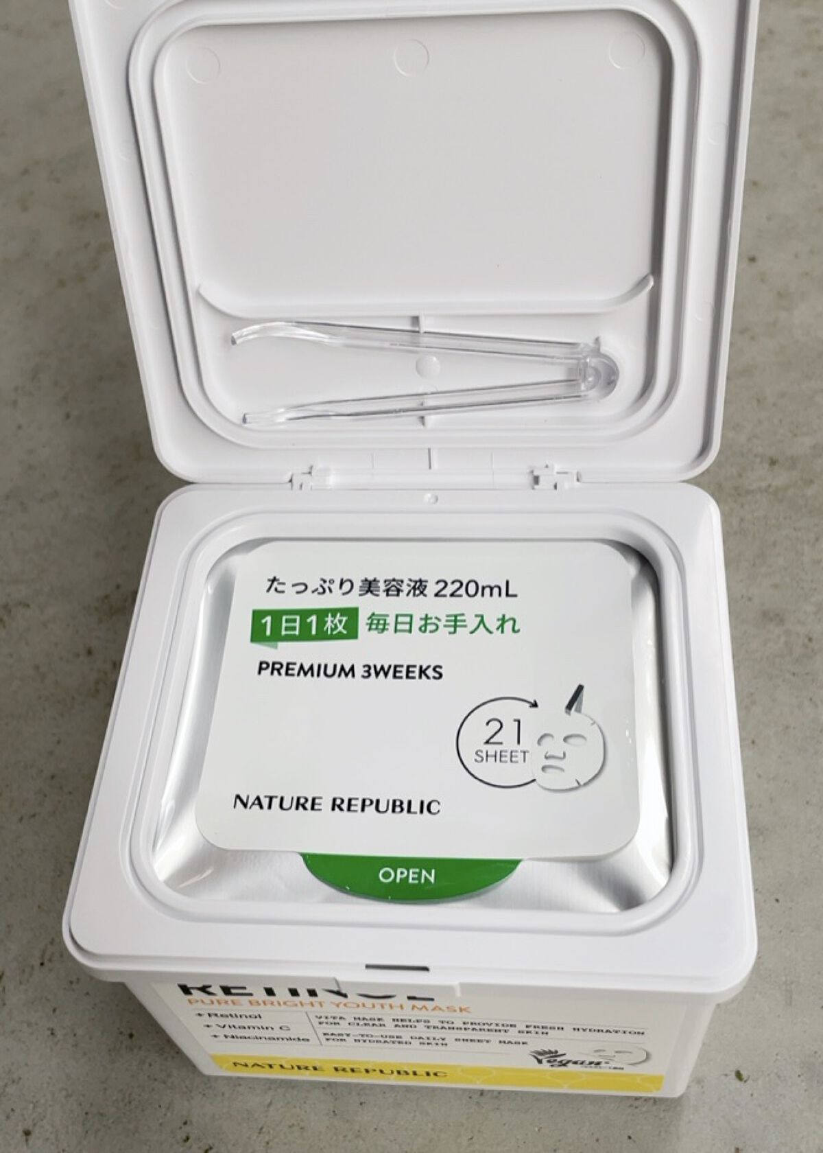 育児中でも肌ケアしたいママへ🌿レチノール×ビタミン11種✨時短ごほうびケアが出来る✨ネイチャーリパブリックレチノールピュアなブライトユースシートマスク❣️ピンセット付きで1枚ずつ取り出せて貼るだけでくすみ、毛穴、乾燥にアプローチ✨寝かしつけ後...
