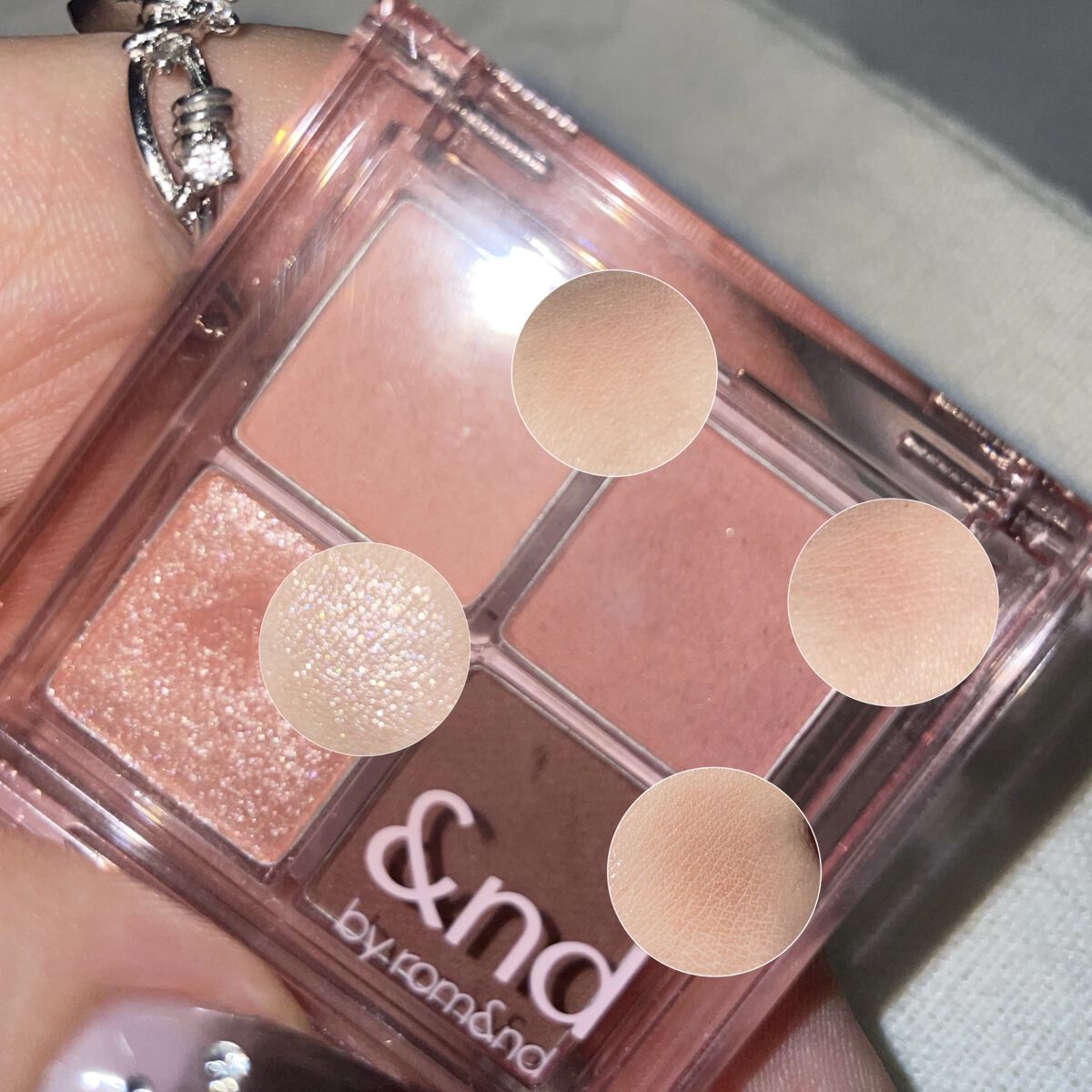 柔らかくて密着力の高いテクスチャーでマット3色ラメ1色のアイシャドウきなっています🥰 ソフトブラウンは大人っぽいシックなブラウン系の印象を演出できます🫶 明るさが欲しい方はアップルシナモンの方が良いかも🤔 甘めが好きな方はローズフォグが◎
