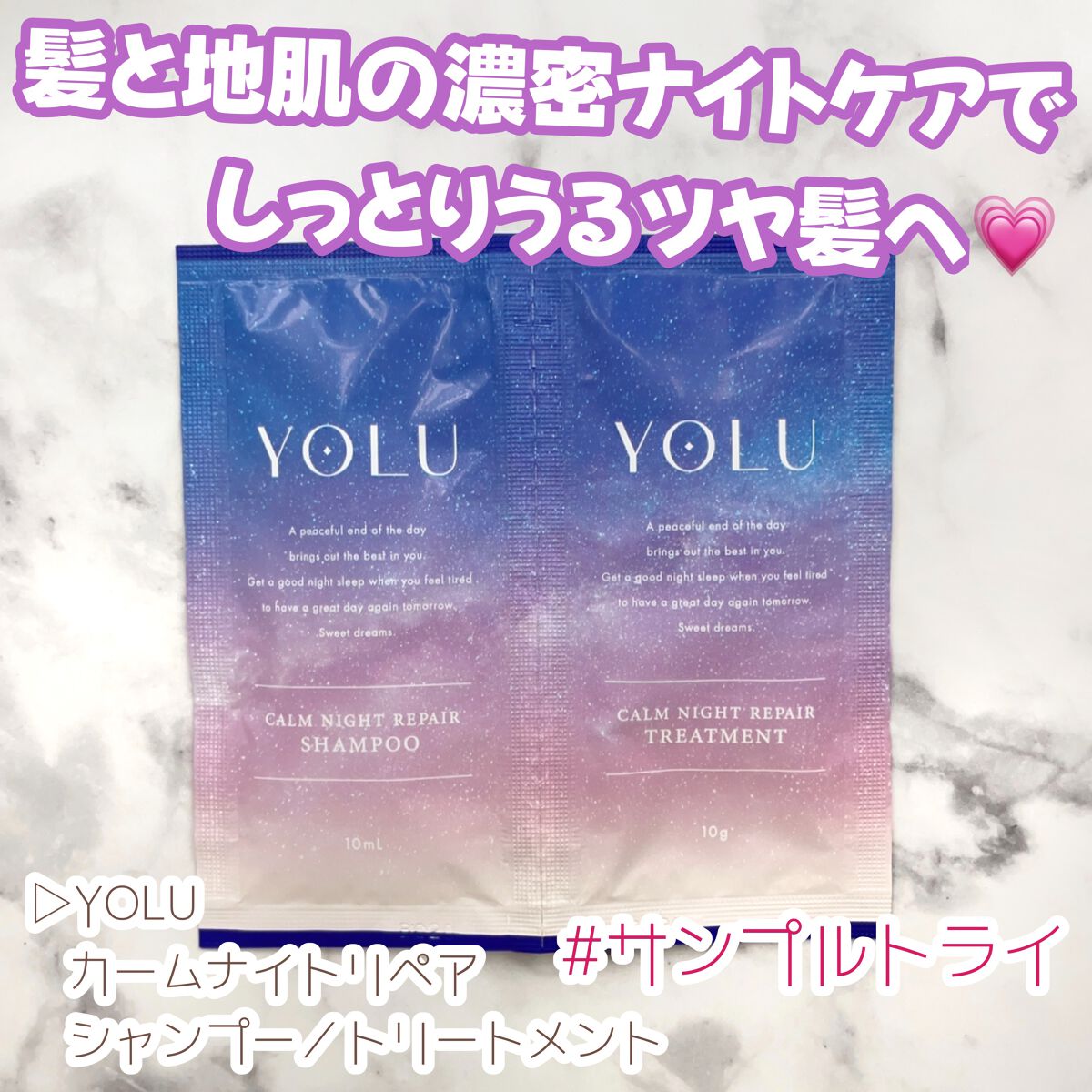 睡眠中も髪を守る。YOLUカームナイトリペアシャンプー/トリートメントレビューLIPSを通じてYOLU様からカームナイトリペアシャンプー/トリートメントを頂きました 「ナイトセラミド※1配合」でダメージを受けた髪に潤いを与え、「ネムノキエキス...
