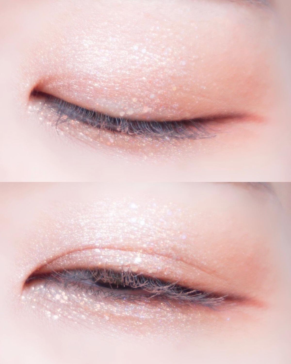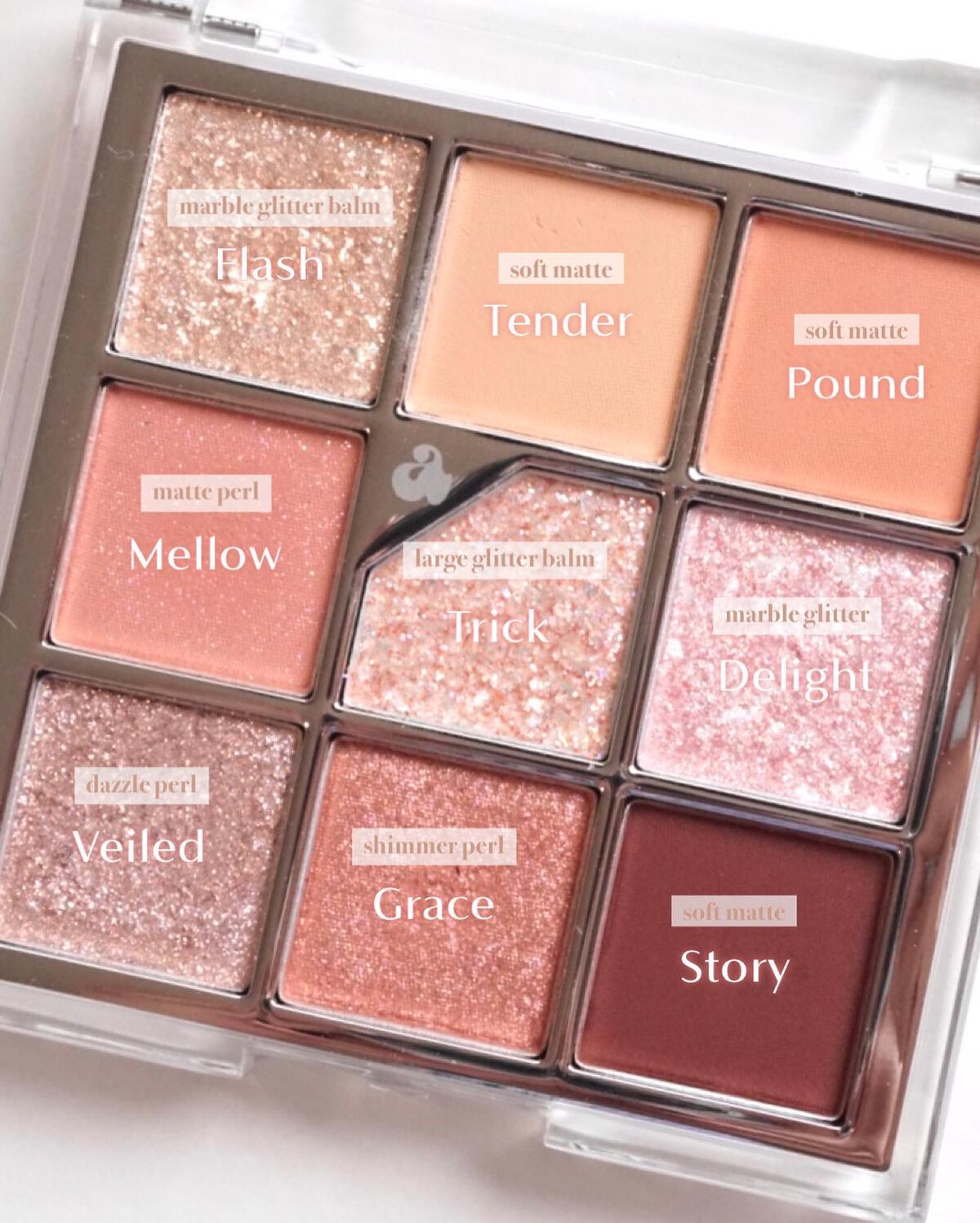 くすみグレー系のパレットが欲しく購入し、家に届いて開封した時意外とブラウン感が強くて失敗したかな?と思いましたが、瞼に塗るとくすみグレージュに発色。 左上のベースカラーはほとんど発色はないといってもいいくらい、他2つのマットカラーは発色がよく、ラメシャドウは割と煌めきが強い繊細ラメが使用されており、ギラッと輝く印象を受けました。 マットシャドウはrom&nd特有の比較的柔らかめでサラッとした質感、ラメシャドウは繊細ラメでサラッとしていて思ったよりラメ飛びはしない印象です。