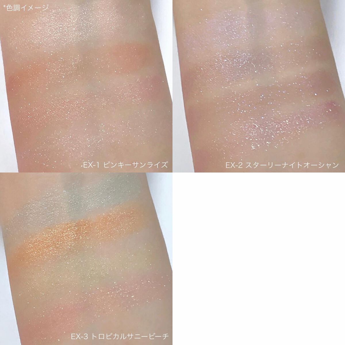 - <EX-1 ピンキーサンライズ> 合成フルオロフロゴパイト、ジメチコン、タルク、シリカ、リンゴ酸ジイソステアリル、マイカ、トリ(カプリル酸/カプリン酸)グリセリル、ラウロイルリシン、ダイマージリノール酸(フィトステリル/イソステアリル/セチル/ステアリル/ベヘニル)、スクワラン、(ジメチコン/ビニルジメチコン)クロスポリマー、ミリスチン酸亜鉛、ワセリン、セスキイソステアリン酸ソルビタン、キャンデリラロウ炭化水素、ポリグリセリル-3ポリジメチルシロキシエチルジメチコン、(ジビニルジメチコン/ジメチコン)コポリマー、トコフェロール、水、(C12,13)パレス-23、(C12,13)パレス-3、フェノキシエタノール、デヒドロ酢酸Na、クロルフェネシン、エチルパラベン、メチルパラベン、(+/-)Al、アルミナ、カオリン、グンジョウ、コンジョウ、酸化チタン、酸化鉄、水酸化Al、酸化スズ、ホウケイ酸(Ca/Al)、黄4、青1、赤202、赤226 <EX-2 スターリーナイトオーシャン> 合成フルオロフロゴパイト、ジメチコン、タルク、シリカ、リンゴ酸ジイソステアリル、マイカ、トリ(カプリル酸/カプリン酸)グリセリル、ラウロイルリシン、ダイマージリノール酸(フィトステリル/イソステアリル/セチル/ステアリル/ベヘニル)、スクワラン、(ジメチコン/ビニルジメチコン)クロスポリマー、ミリスチン酸亜鉛、ワセリン、セスキイソステアリン酸ソルビタン、キャンデリラロウ炭化水素、ポリグリセリル-3ポリジメチルシロキシエチルジメチコン、(ジビニルジメチコン/ジメチコン)コポリマー、トコフェロール、水、(C12,13)パレス-23、(C12,13)パレス-3、フェノキシエタノール、デヒドロ酢酸Na、クロルフェネシン、エチルパラベン、メチルパラベン、(+/-)Al、アルミナ、カオリン、グンジョウ、コンジョウ、酸化チタン、酸化鉄、水酸化Al、酸化スズ、ホウケイ酸(Ca/Al)、黄4、青1、赤202、赤226 <EX-3 トロピカルサニービーチ> 合成フルオロフロゴパイト、ジメチコン、タルク、シリカ、リンゴ酸ジイソステアリル、マイカ、トリ(カプリル酸/カプリン酸)グリセリル、ラウロイルリシン、ダイマージリノール酸(フィトステリル/イソステアリル/セチル/ステアリル/ベヘニル)、スクワラン、(ジメチコン/ビニルジメチコン)クロスポリマー、ミリスチン酸亜鉛、ワセリン、セスキイソステアリン酸ソルビタン、キャンデリラロウ炭化水素、ポリグリセリル-3ポリジメチルシロキシエチルジメチコン、(ジビニルジメチコン/ジメチコン)コポリマー、トコフェロール、水、(C12,13)パレス-23、(C12,13)パレス-3、フェノキシエタノール、デヒドロ酢酸Na、クロルフェネシン、エチルパラベン、メチルパラベン、(+/-)Al、アルミナ、カオリン、グンジョウ、コンジョウ、酸化チタン、酸化鉄、水酸化Al、酸化スズ、ホウケイ酸(Ca/Al)、黄4、青1、赤202、赤226
