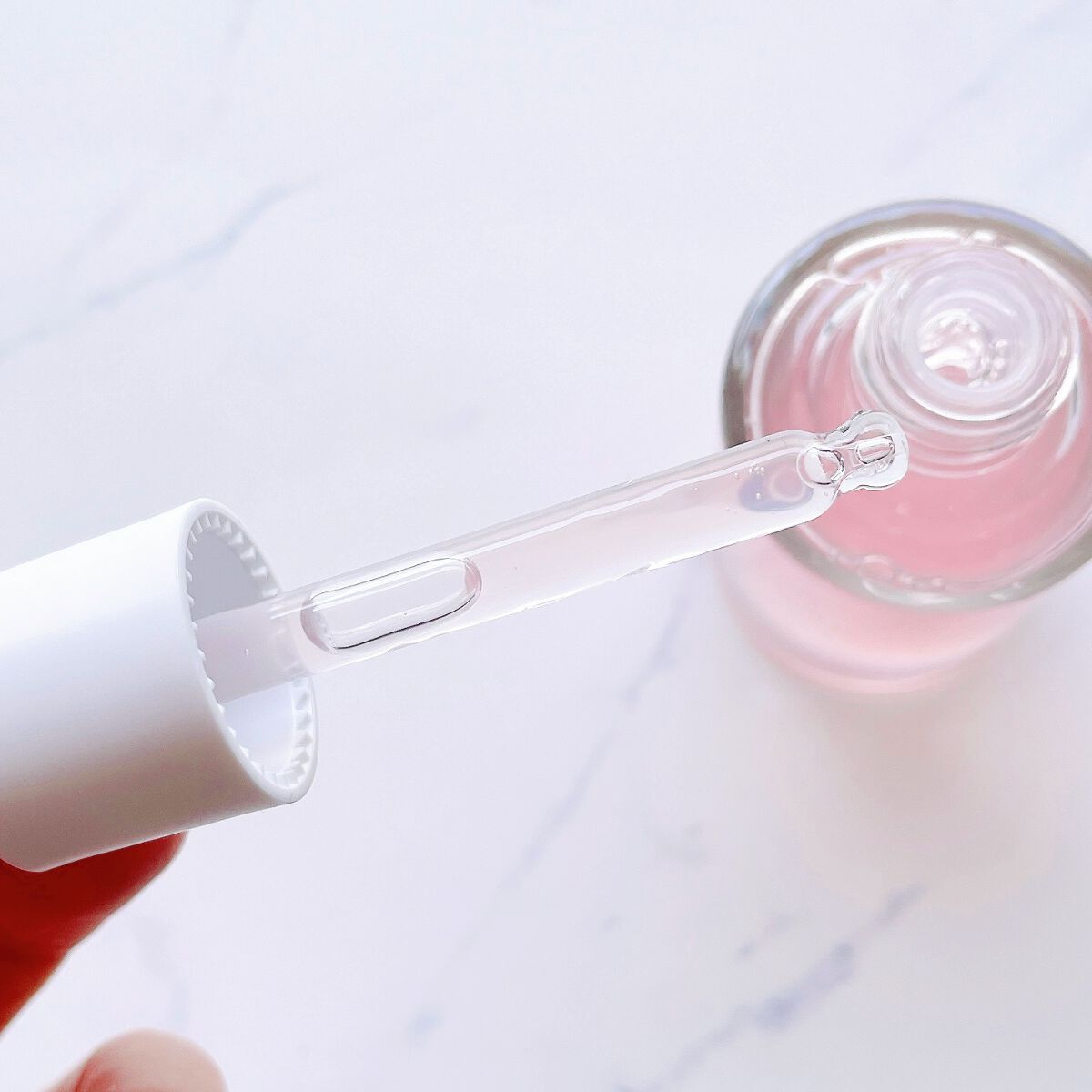 こちらの商品は、桃から抽出した自然由来成分、PEACHNIA(TM)を70%配合し、肌にダメージを与えることなく肌のトーン・キメ・ツヤにアプローチしてくれるそう✨ また、肌の透明感を上げるナイアシンアミド(保湿成分)を5%配合していてシミ・そばかすの元となるメラニンが肌表面に露出することを阻害して透明感のある、クリアな肌へ導いてくれるそうですよ👍 手に取ると、とろみ感の強い濃厚なテクスチャー!2、3滴だと量が少ないかな~と思いきや、なめらかで伸びが良い😌 お肌に溶け込むようになじんでくれます🎵 ベタベタせず、しっとり、もっちりとした付け心地💛 ピンクのセラムと透明の容器の組み合わせが可愛くて気分の上がるスキンケアです✨