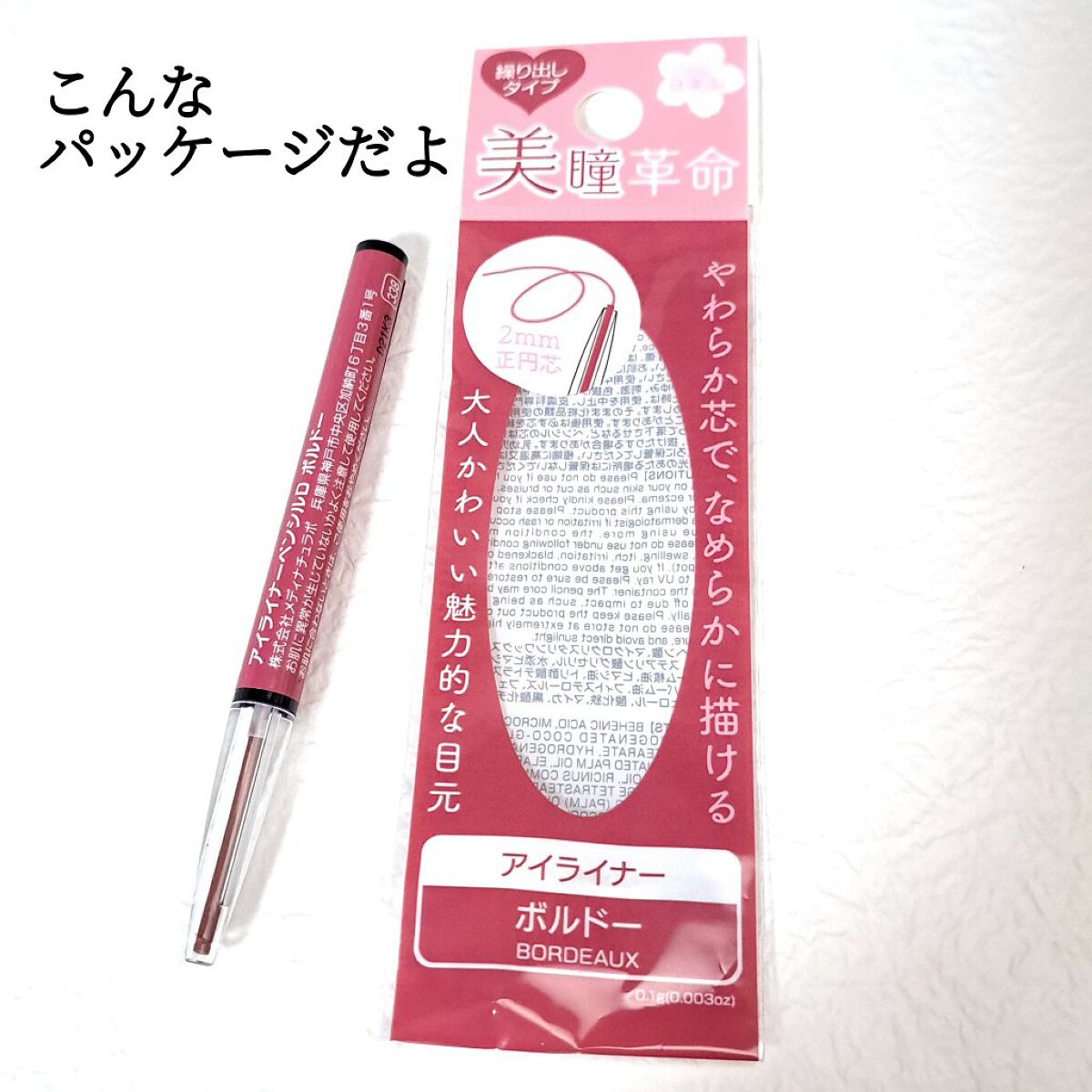 - 繰り出しタイプの日本製アイライナーペンシル。目尻まで描きやすい2ミリの細芯。
