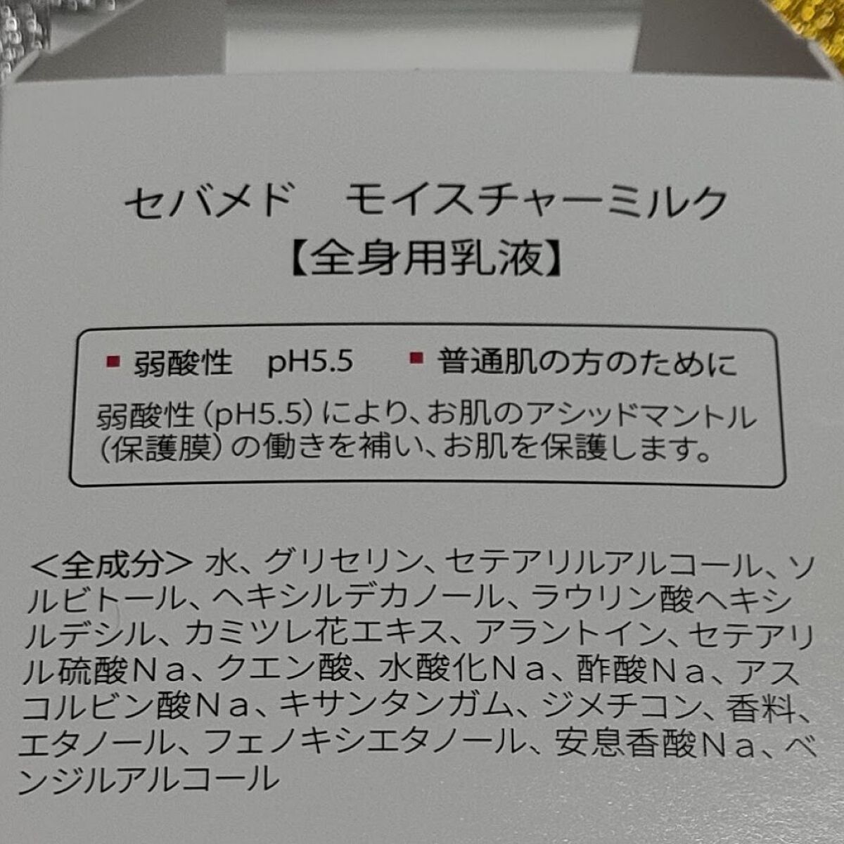 - 水、グリセリン、セテアリルアルコール、ソルビトール、ヘキシルデカノール、ラウリン酸ヘキシルデシル、カミツレ花エキス、アラントイン、セテアリル硫酸Na、クエン酸、水酸化Na、酢酸Na、アスコルビン酸Na、キサンタンガム、ジメチコン、香料、エタノール、フェノキシエタノール、安息香酸Na、ベンジルアルコール