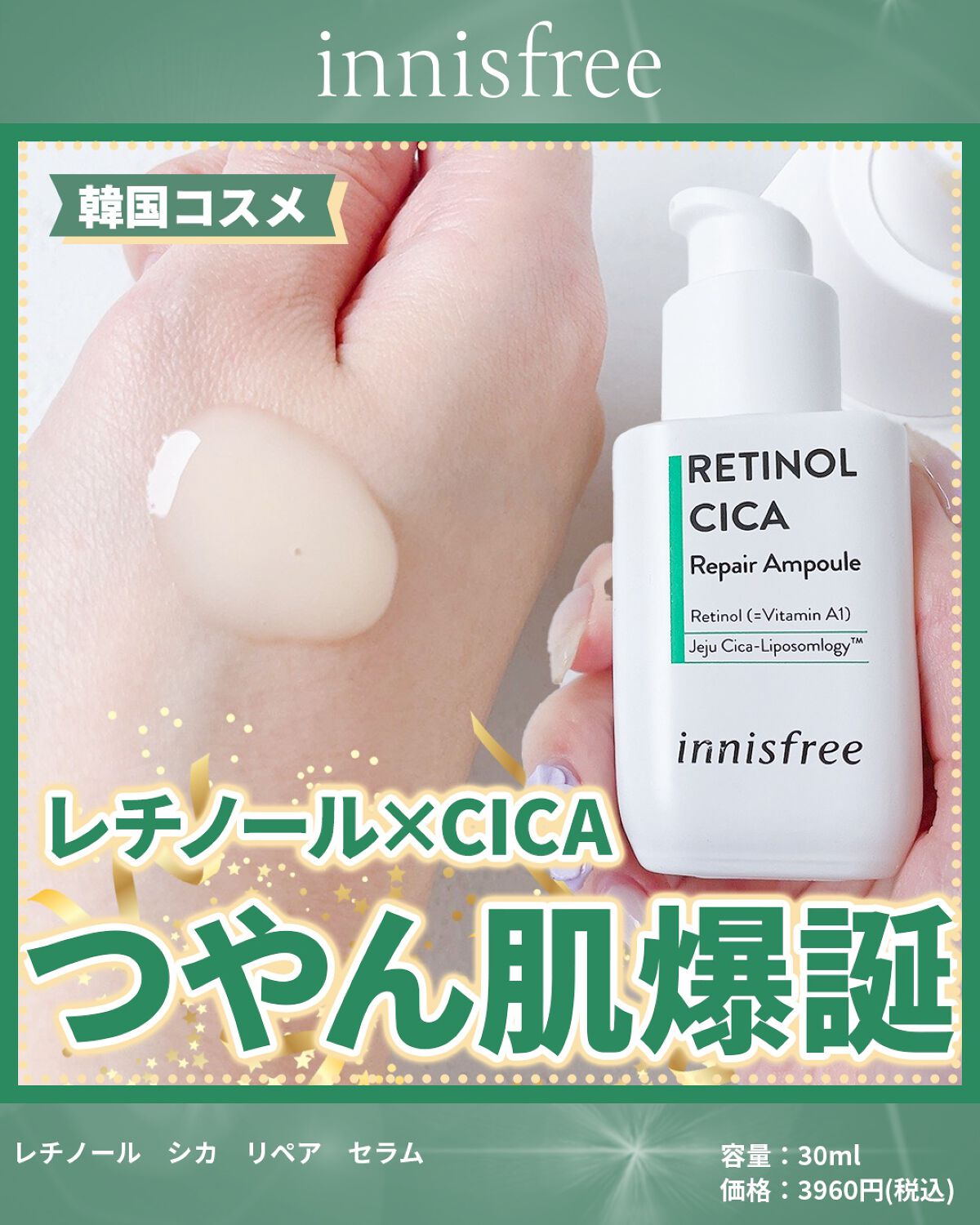 イニスフリーを代表する商品💁♀️ 純粋レチノール*1とシカ*2をW配合で、詰まり毛穴や角質をケアしつるんとむき卵肌へ🐰 みずみずしいなめらかなテクスチャーで、伸び・肌なじみが良くベタつき感のない使用感🤍