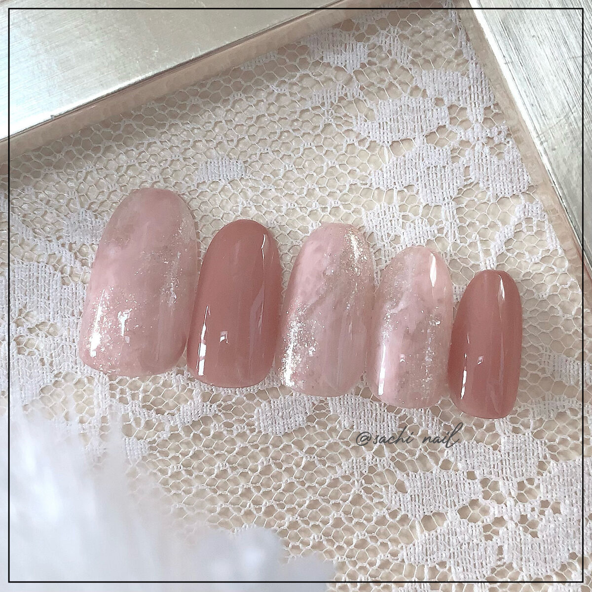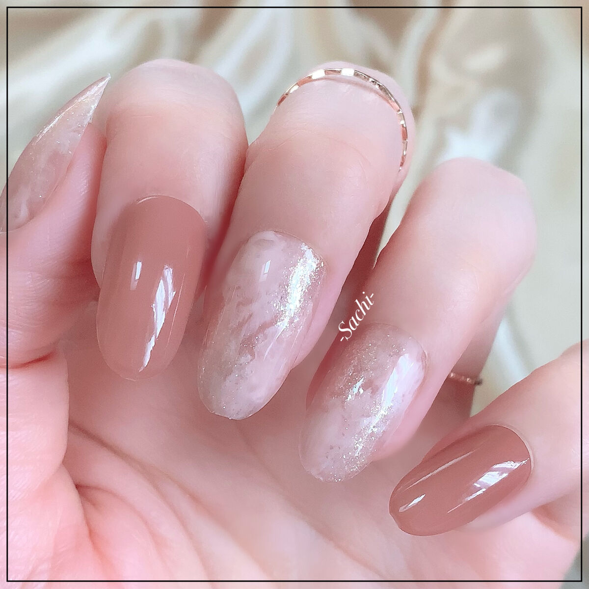 ワンカラーでも指ごとに色を変えるだけでオシャレに見えます💕 画像のようにゴールドラインとストーンを少し足すだけで華やかさがアップ🥰 何度かご紹介したことのあるスポンジで作るグラデーションです✨ スポンジを使うことで境目が綺麗に馴染んでくれます💕 アルミホイルの上でブラウンとトップコートを1:1くらいで混ぜたものを、トップコートのハケに取って3箇所に塗るだけ👌 事前に混ぜたものを塗ることで、爪の上でぼかすより簡単に出来ます💕 ベースカラーが乾く前に点置きしてぼかすことで綺麗にぼかせます✨ スピードが大事なので、使うポリッシュのキャップは全て開けておきましょう😊 天然石のラインはガタガタの方がより天然石っぽく見えるので、ラインを描くのが苦手な方でも大丈夫🙆♀️ 難しそうに見えて、やってみると意外と簡単に出来ます♡