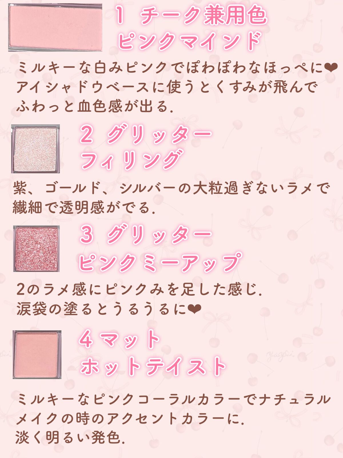 ・マット7色、ラメ1色、シマー1色、グリッター1色 好きな質感に仕上げられるパレットになってます. ・パープルで透明感メイク、ピンクで可愛らしいメイクができます. ・全体的に淡い発色で濃淡の調節がしやすくて、すごく濃いメイクにならない. ・ブラウンが苦手なので締め色が淡いカラーなのが嬉しい. ・パープルは白みとピンクみが強めなのでバブリーにならない. ・瞼のくすみが気になっていたのですが、1のベースカラーを使用すると綺麗にくすみが飛んで気にならなくなった. ・マットが好きなのでマットが多めで嬉しい. ・ラメカラーがどれもかわいい. ・マットは粉飛びするものが多いですが、これはしっとり質感で粉飛びしない. ・なんと言っても全ての色がかわいすぎる!!! ・くすみが苦手な人. ・韓国っぽい白みピンクのメイクがしたい人. ・濃い締め色が苦手な人. ・ラメやシマーで質感を変えて使えるカラーを探して人.