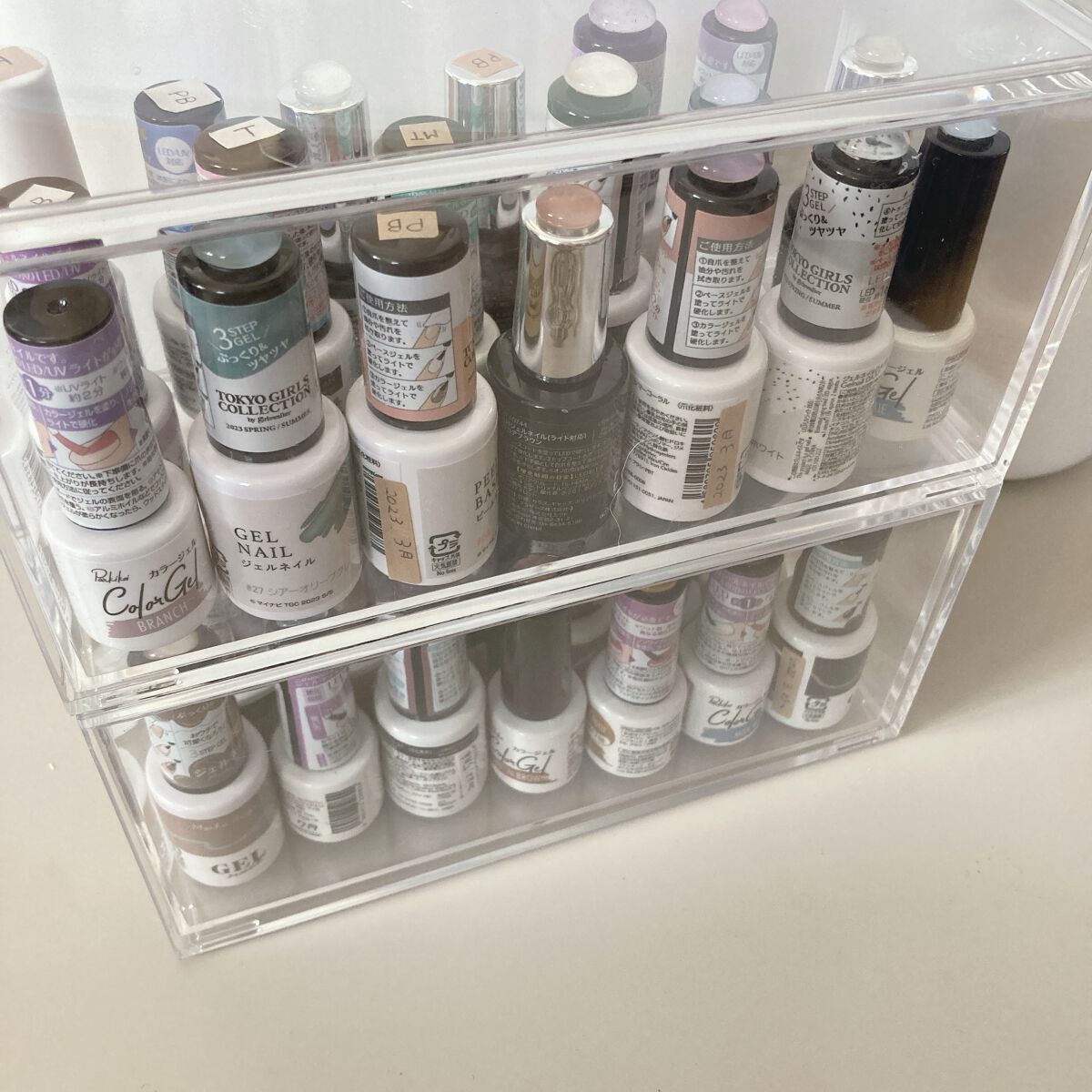 手持ちのネイルカラーが増えすぎてどこに何があるかわからなくなっていていたので収納方法考えました。 とりあえず100円ショップでどうにかなるかと、ダイソーへ行き買ってきたのは1個330円で売っているこの透明な、重なる透明収納ケース。 重ねられるので本数増えても大丈夫😊 このボックスのケースに、ネイルを横に倒して並べて収納しているんですが、こうやって収納するとボトルのそこに貼ってあるシールに書かれている品番と色が一目でわかるようになって、取り出したい色がどこにあるかぱっとわかるんです。 大変使いやすくなりました💡 私が重視したポイント○本数が増えても対応できる○収納した後にどこに何があるかすぐわかる